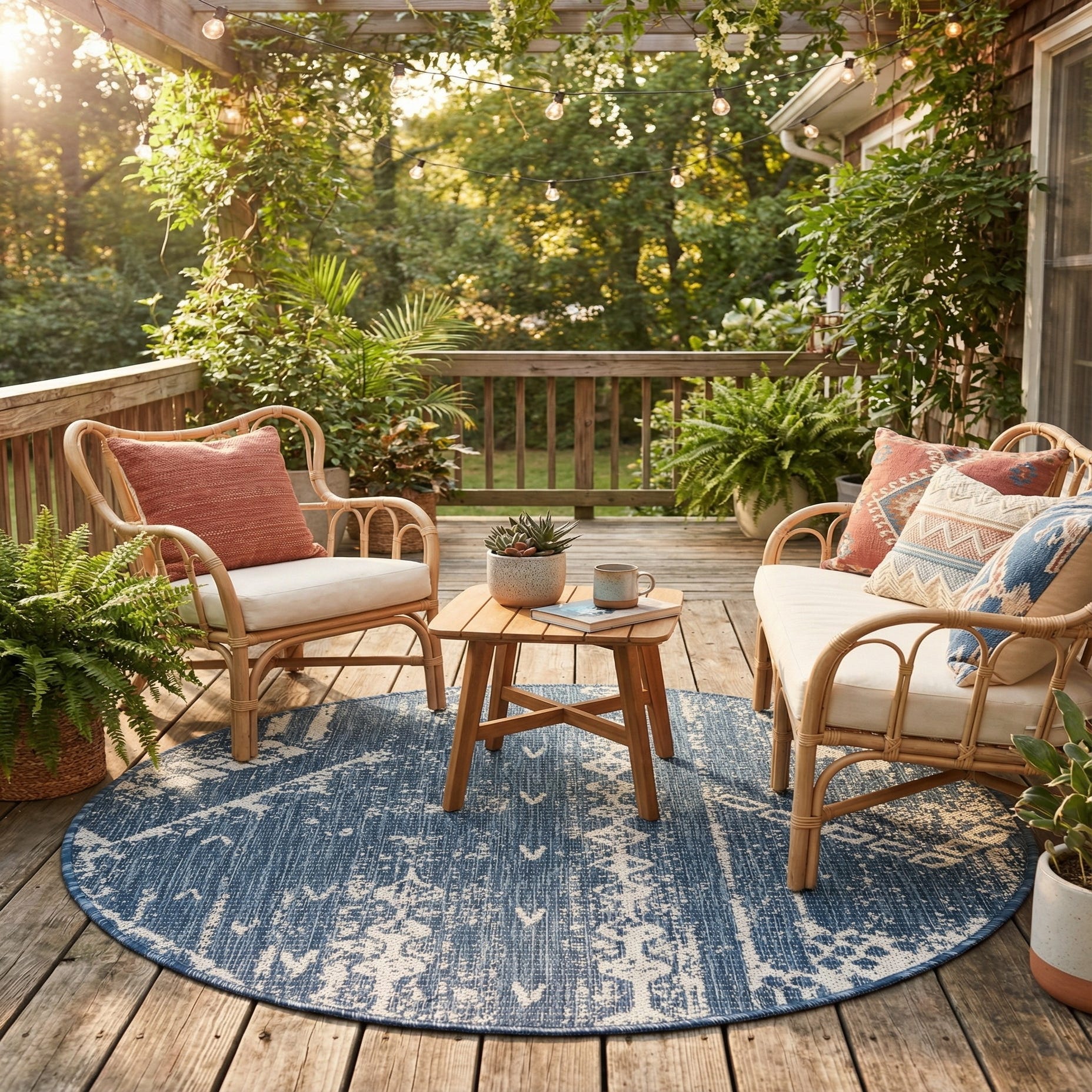 Machine-made from 100% polypropylene, the flat-woven surface is low-profile with a slightly grainy hand that feels firm underfoot, ideal for high-traffic indoor-outdoor spots. Use it to anchor a small bistro table on a balcony, add pattern to a covered porch seating area with wicker and weathered wood, or place it beneath a round side table in a sunroom. It pairs especially well with neutral linens, navy or denim tones, natural textures like rattan and jute, and layered casual interiors that favor relaxed, bohemian-inspired accents.