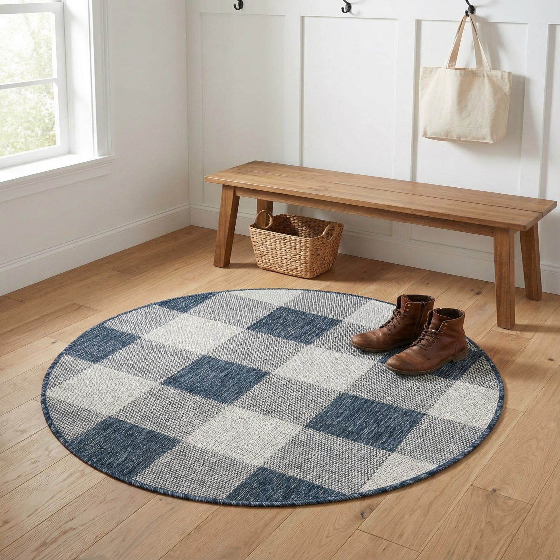 Durable and purpose-built for outdoor living, this round design works well on a covered patio or porch, under a small bistro table, or layered in a sunroom to add pattern without overpowering the space. Pair it with natural wood furniture and linen accents for a coastal-casual feel, or use it with white-washed pieces and navy accessories for a modern farmhouse look.