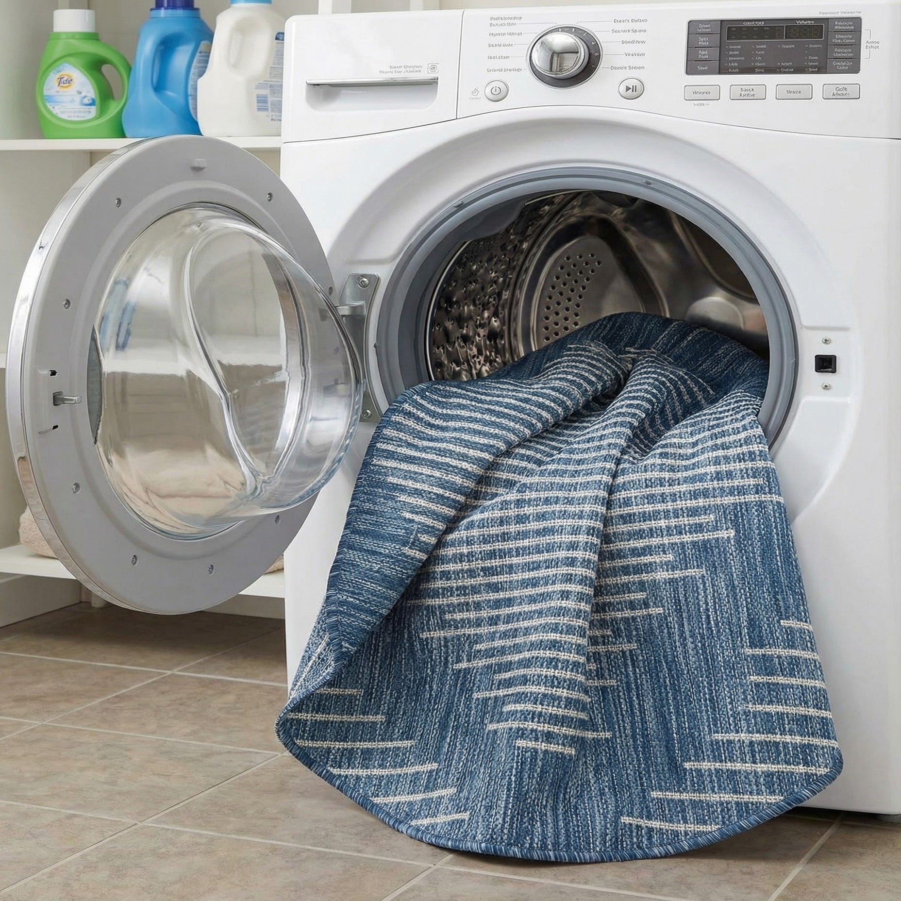 A 3' round blue Southwestern-style outdoor rug with a modern white stripe pattern, perfect for a patio.