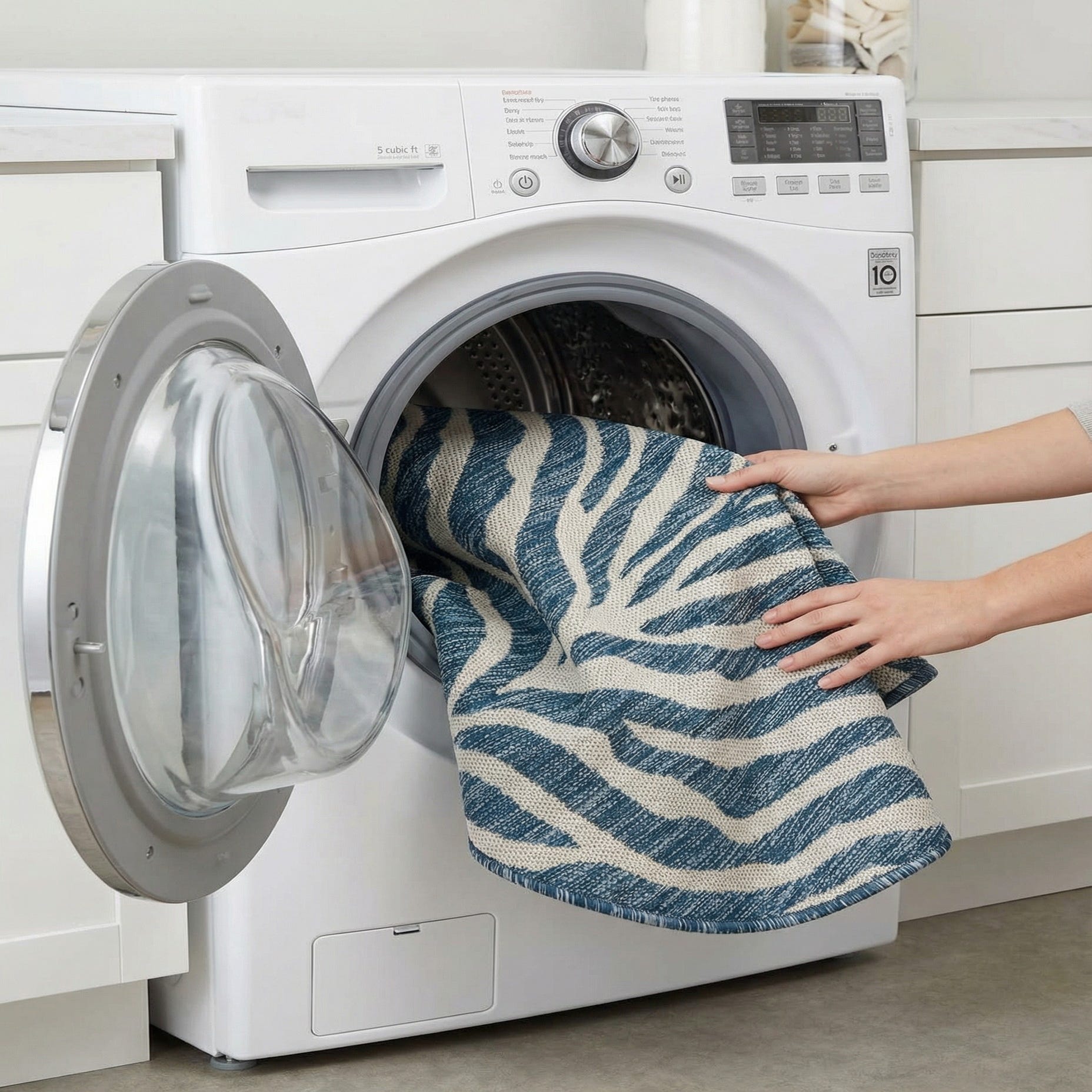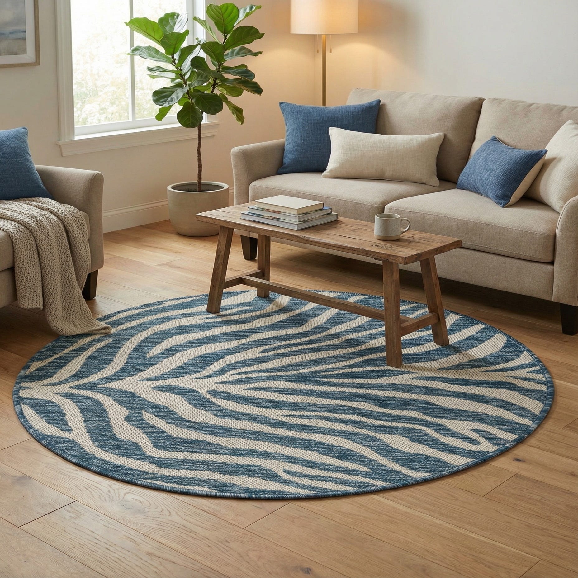 A 3' round blue and cream rug with a modern zebra stripe pattern, suitable for indoor or outdoor use.