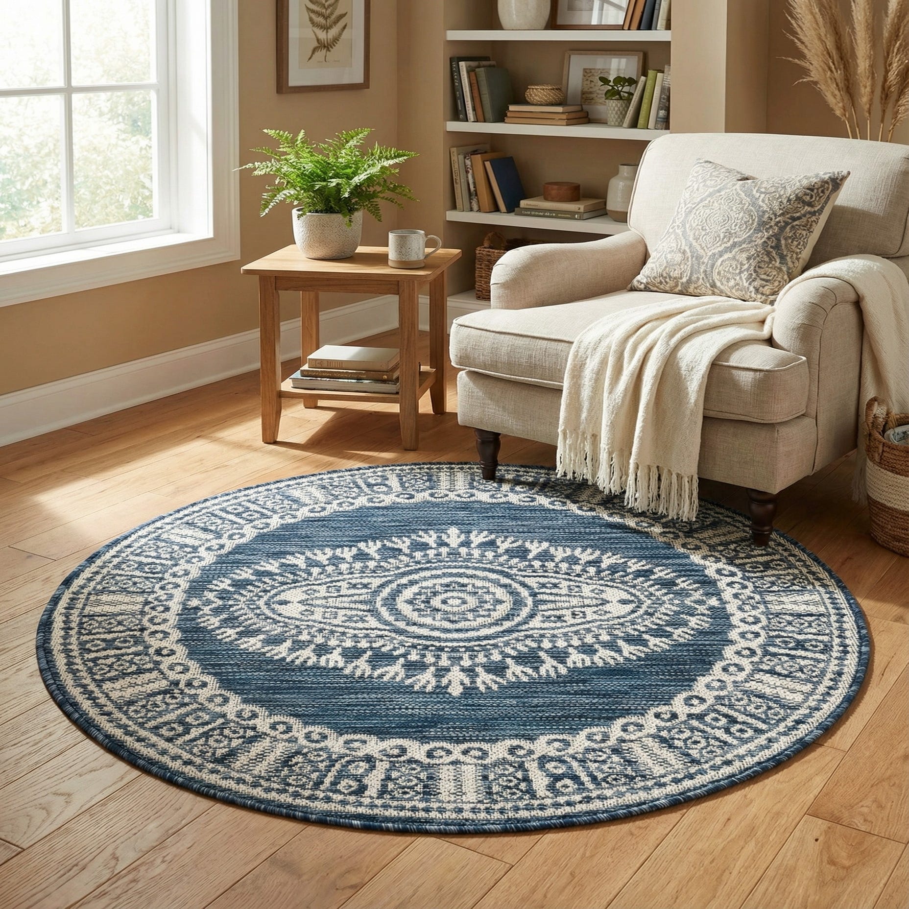 A 3' round blue and white medallion rug with a traditional pattern, suitable for indoor or outdoor use.