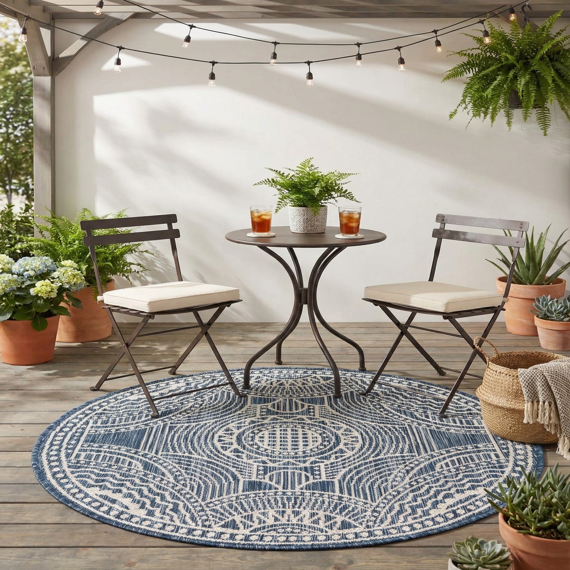 A round 3' blue and white indoor/outdoor rug with a detailed medallion and geometric pattern, ideal for a patio.