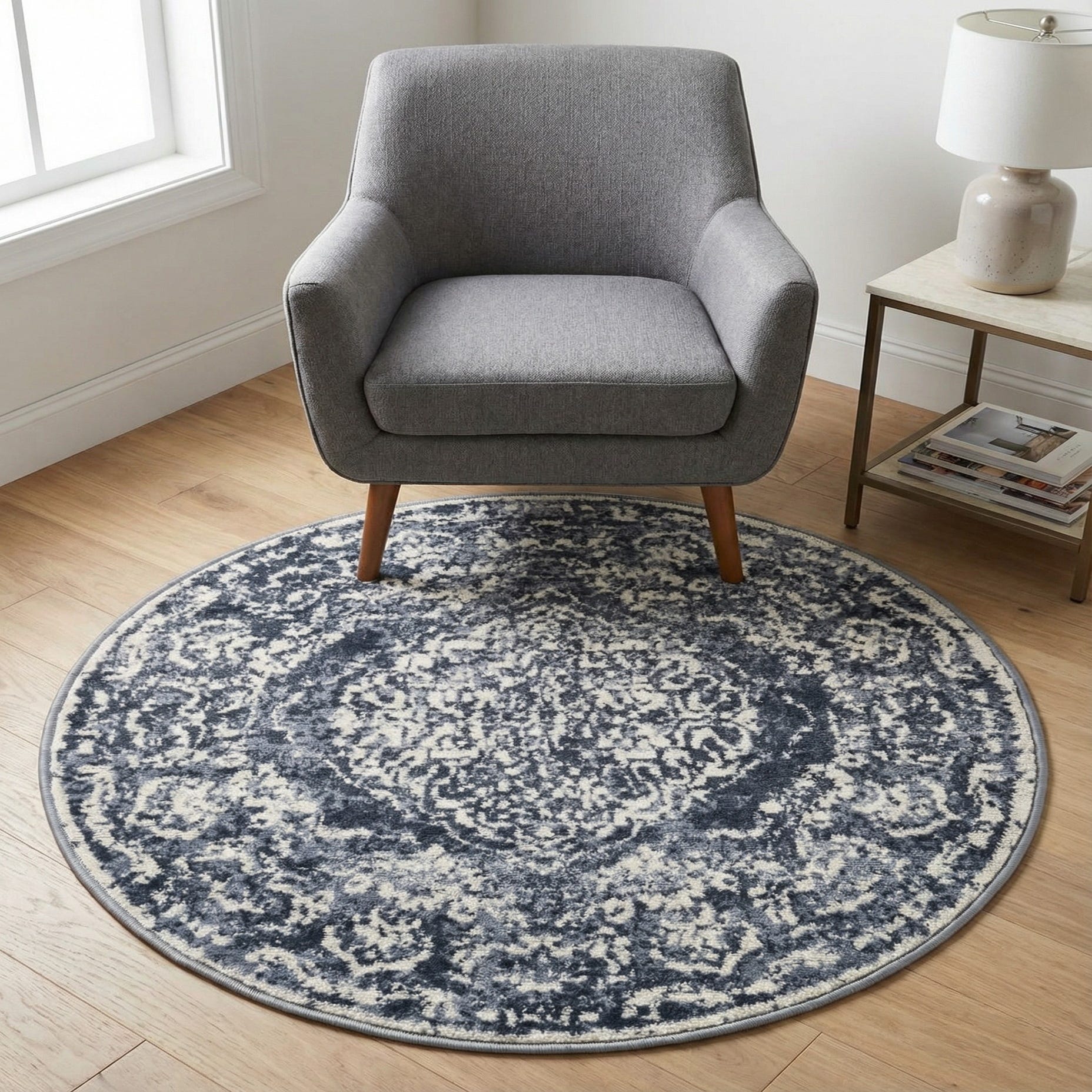 The round silhouette makes this piece an easy choice for anchoring a cozy seating area, tucking beneath a small dining or bistro table, or adding a layered touch at the foot of a bed. The blue-and-ivory palette pairs well with light woods and neutral upholstery for a coastal or transitional scheme, and it also complements painted furniture and crisp white trim in more traditional or cottage-style rooms.