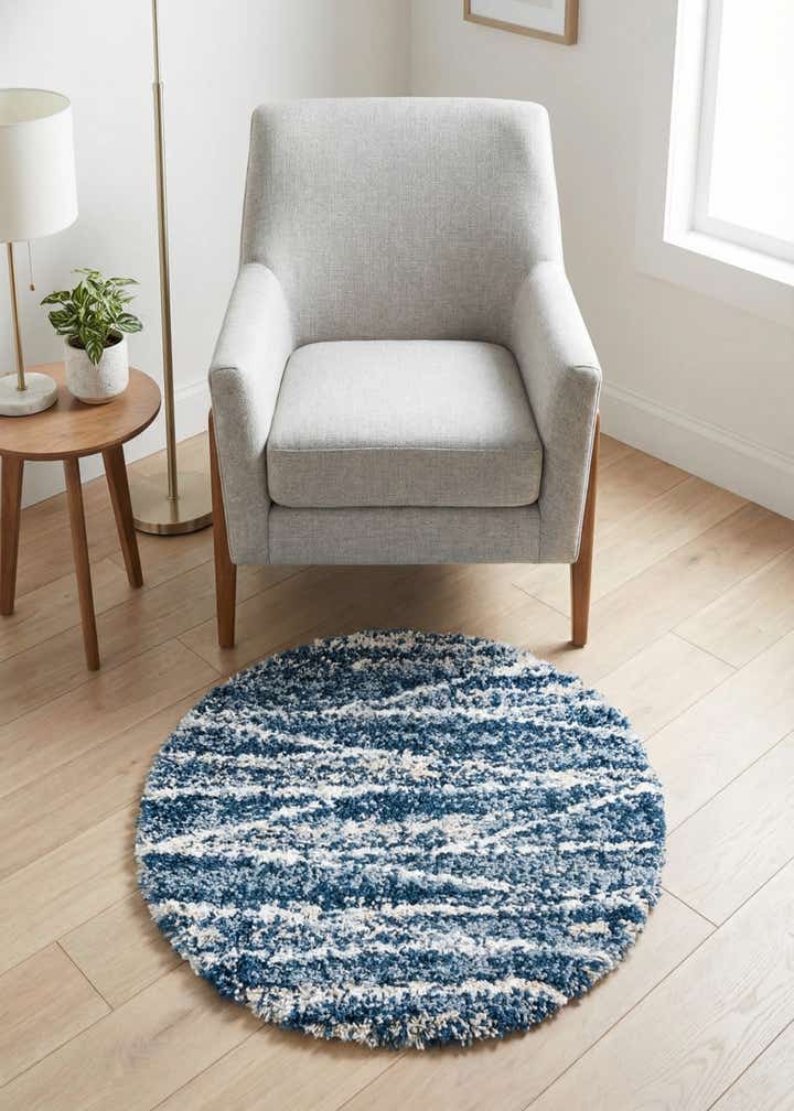 A round blue shag rug with a modern striped pattern in varying shades of blue, white, and light gray.