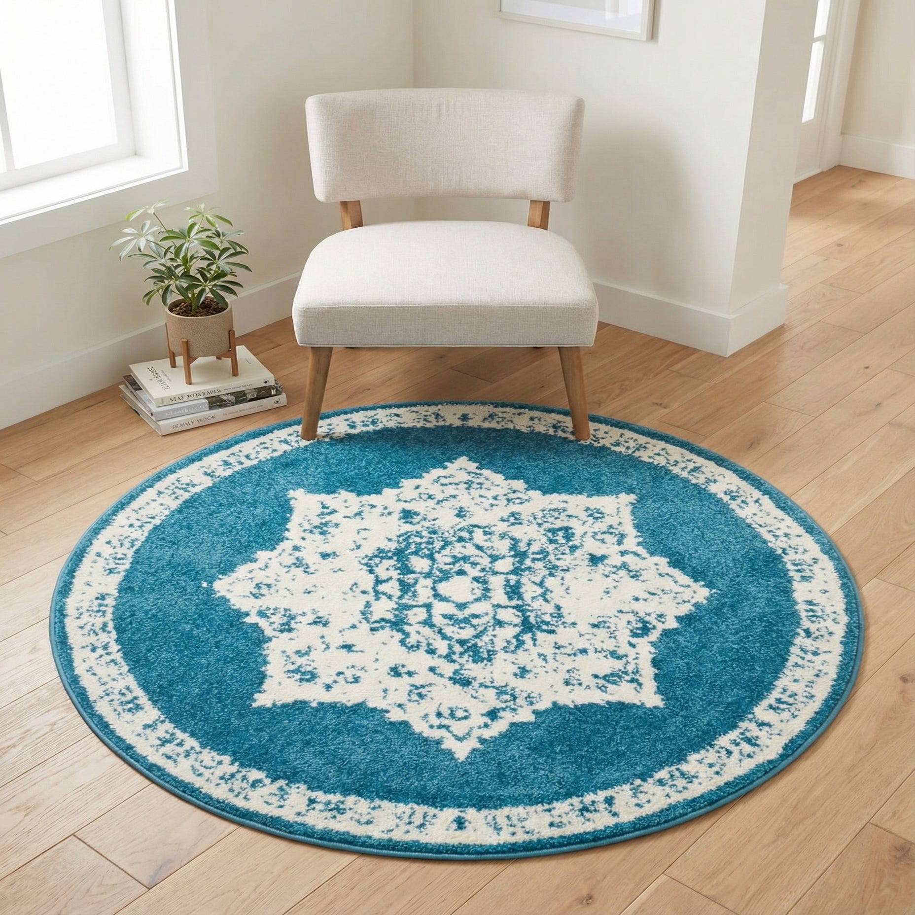 A classic medallion pattern sits at the center of this round rug, rendered in ivory against a deep blue field. The ornate star-shaped motif and surrounding band carry a gently distressed finish that gives the design an aged, hand-worn character without feeling fussy. The machine-made construction from 100% polypropylene produces a low-profile, dense pile that feels soft underfoot with a slightly plush, even surface.