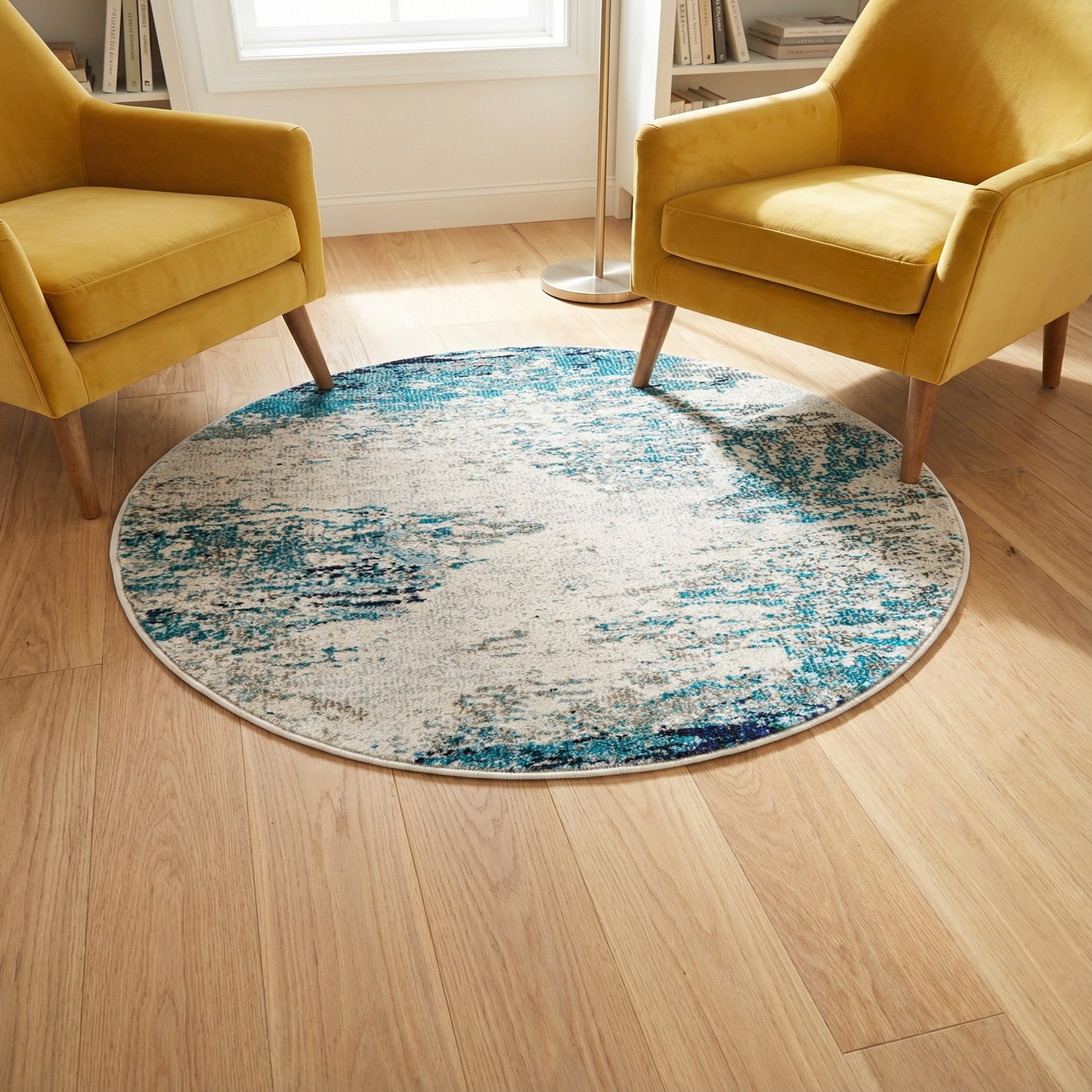 The round shape works well to anchor a small seating grouping, a cozy breakfast nook, or a bedside vignette. Pair it with light wood furniture and navy accents for a coastal-inspired scheme, or use it to add color under neutral upholstery and gray textiles in a contemporary living room. Its durable construction and versatile palette make it an easy fit for casual dining areas, entryways, or any space that benefits from a soft pop of blue.