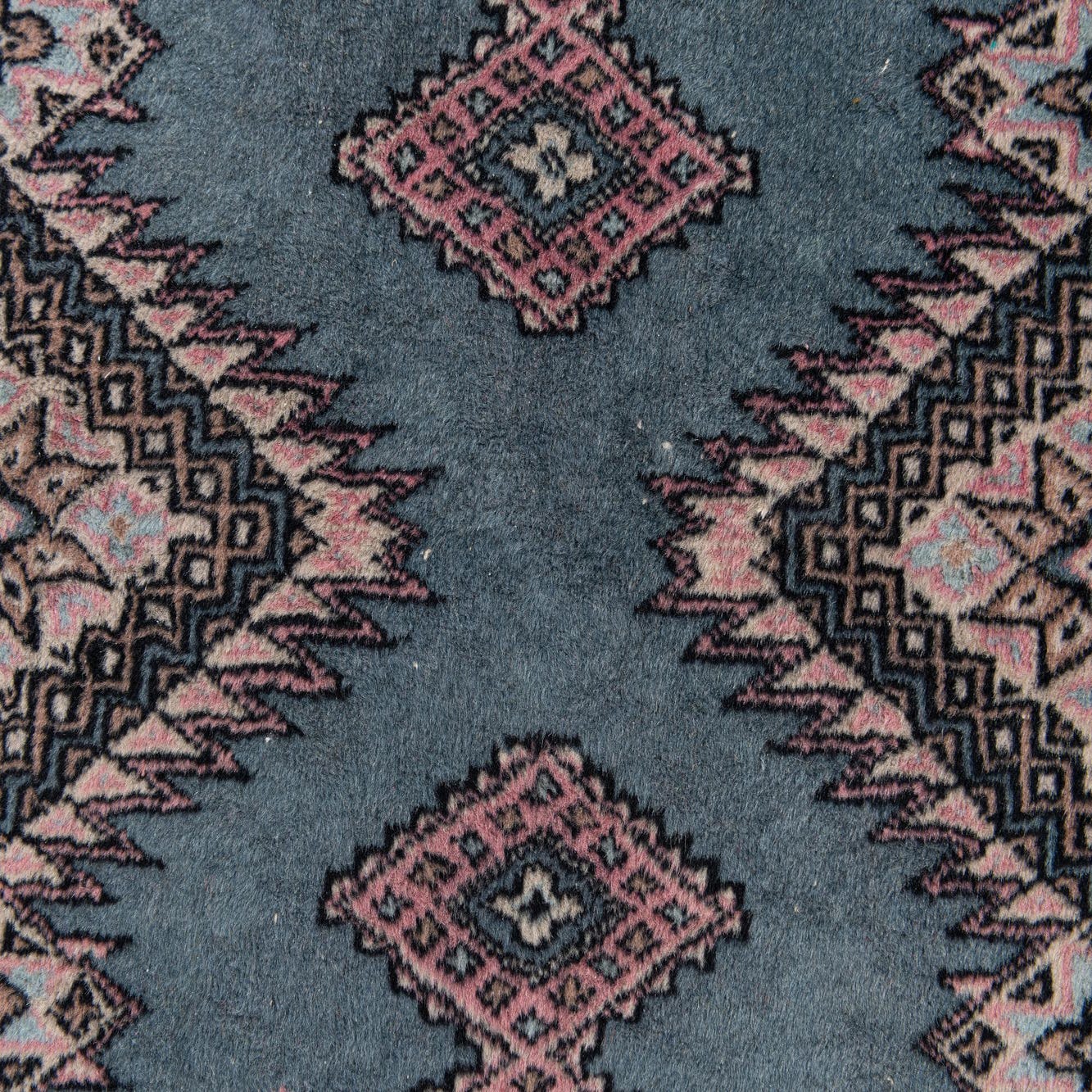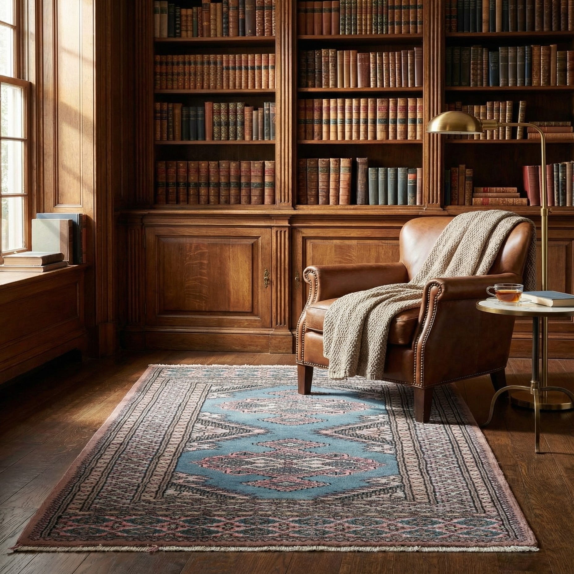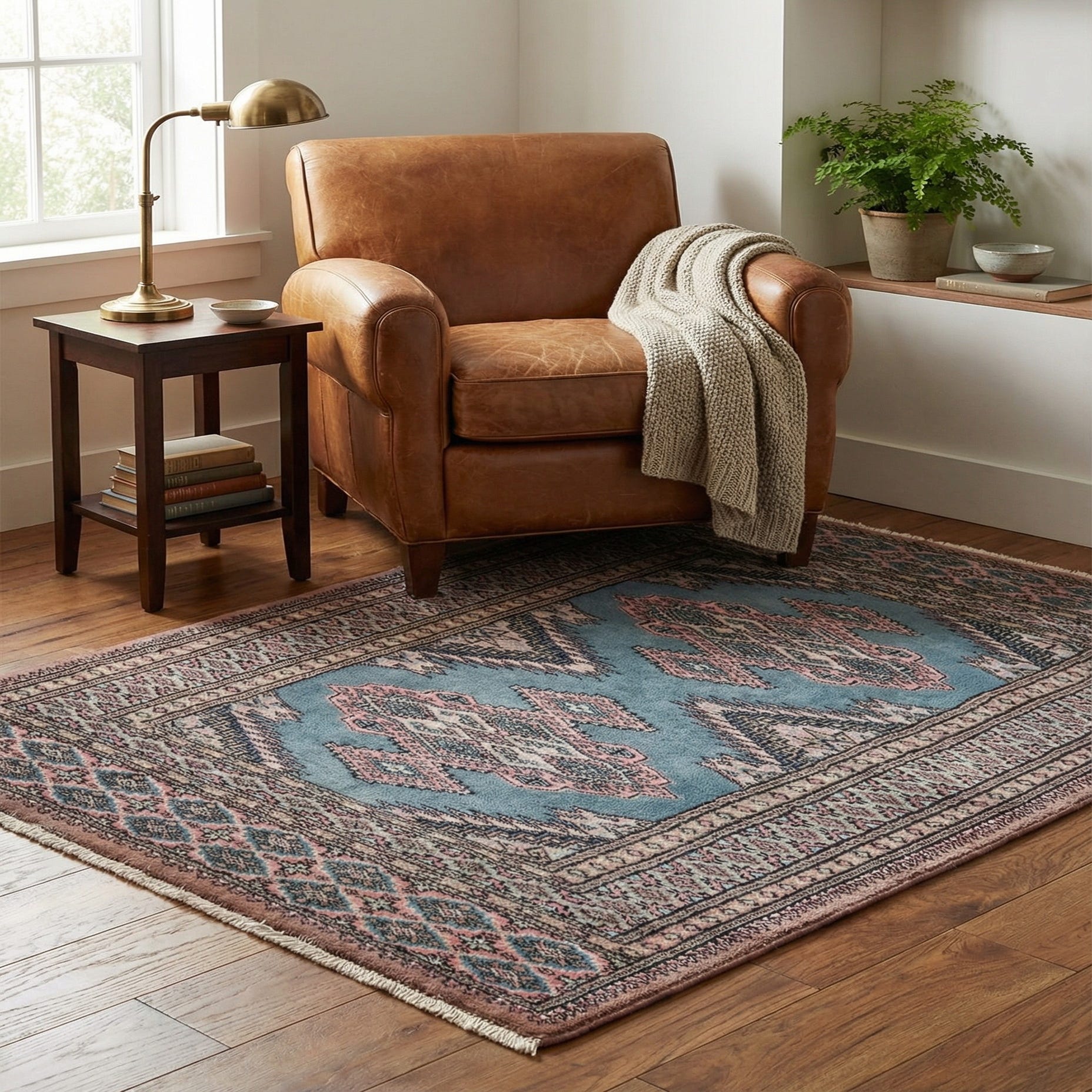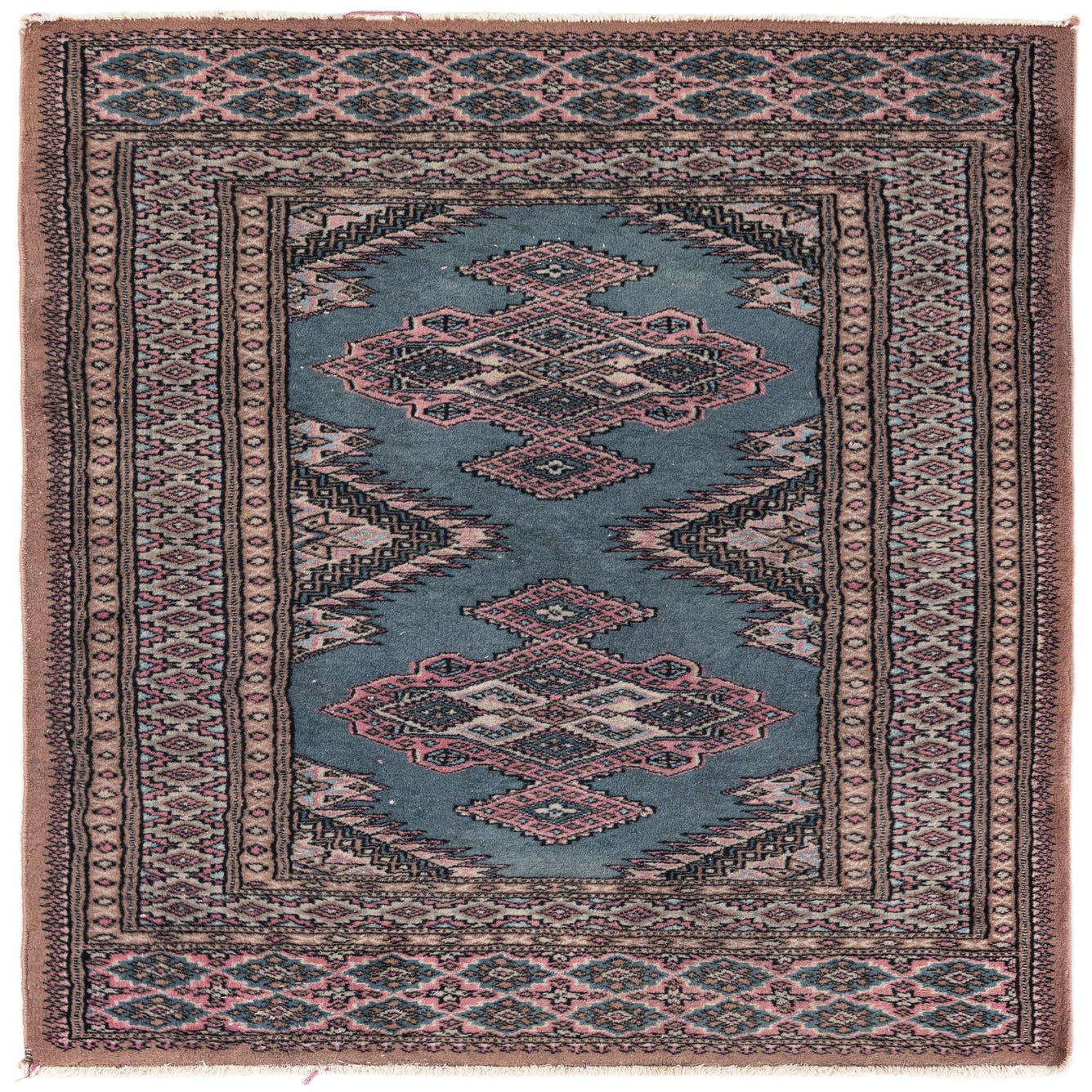 A 3x4 rectangular Bokhara rug featuring a traditional tribal pattern in blues, pinks, and browns.
