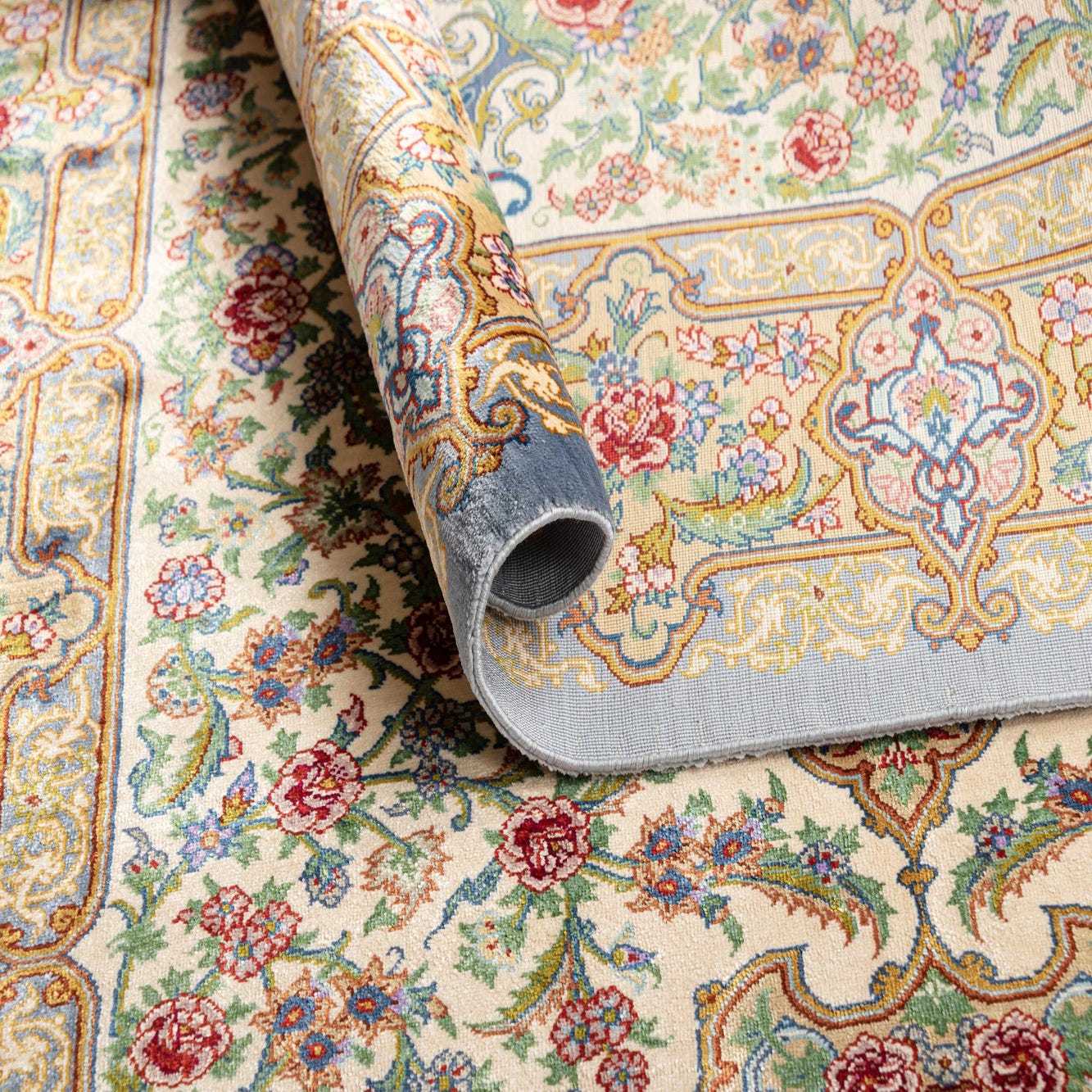 A 3x4 rectangular Ghom Silk Persian rug featuring a central medallion and intricate floral patterns in blues, reds, and golds on a cream background, with a blue border and white fringe.