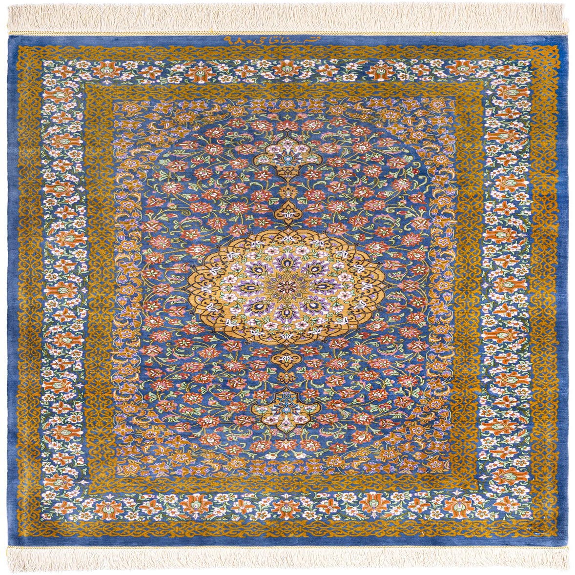 A 3x4 rectangular Ghom Silk Persian rug in shades of blue with an intricate floral medallion pattern and golden borders.