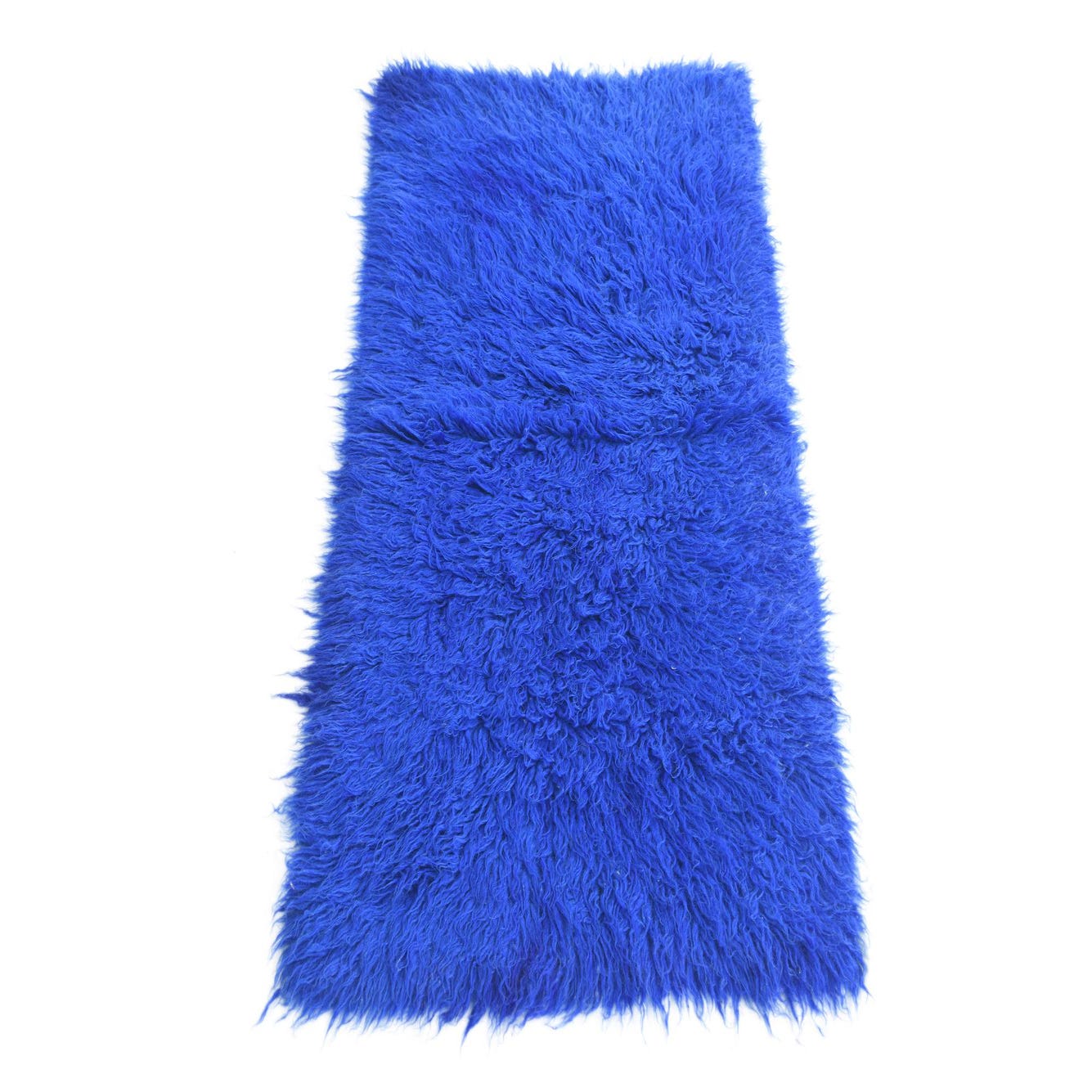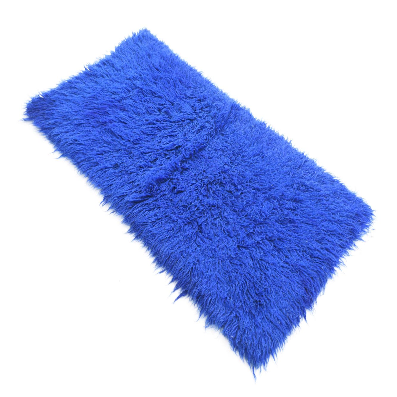 A vibrant 3x4 rectangular shag rug in a deep blue color, featuring a plush, high pile texture.