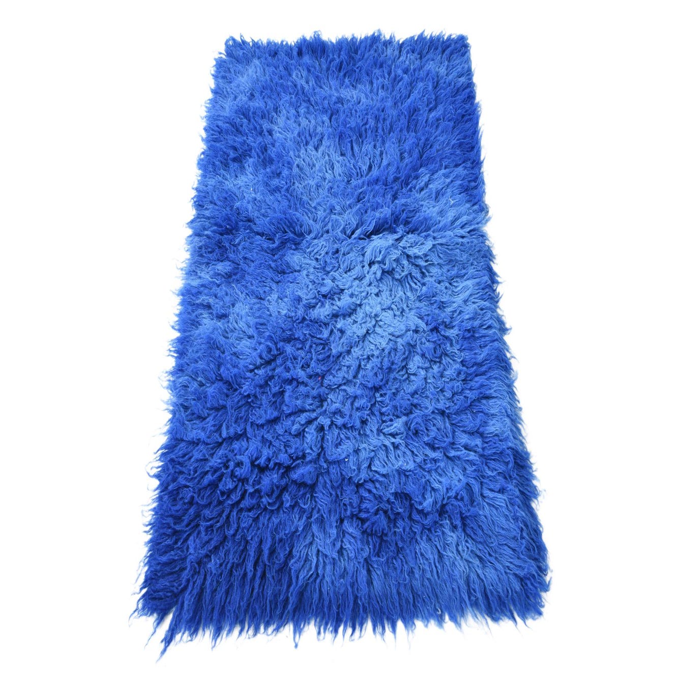 A rectangular 3x4 blue shag rug made of 100% wool, featuring a plush, textured pile in varying shades of blue.