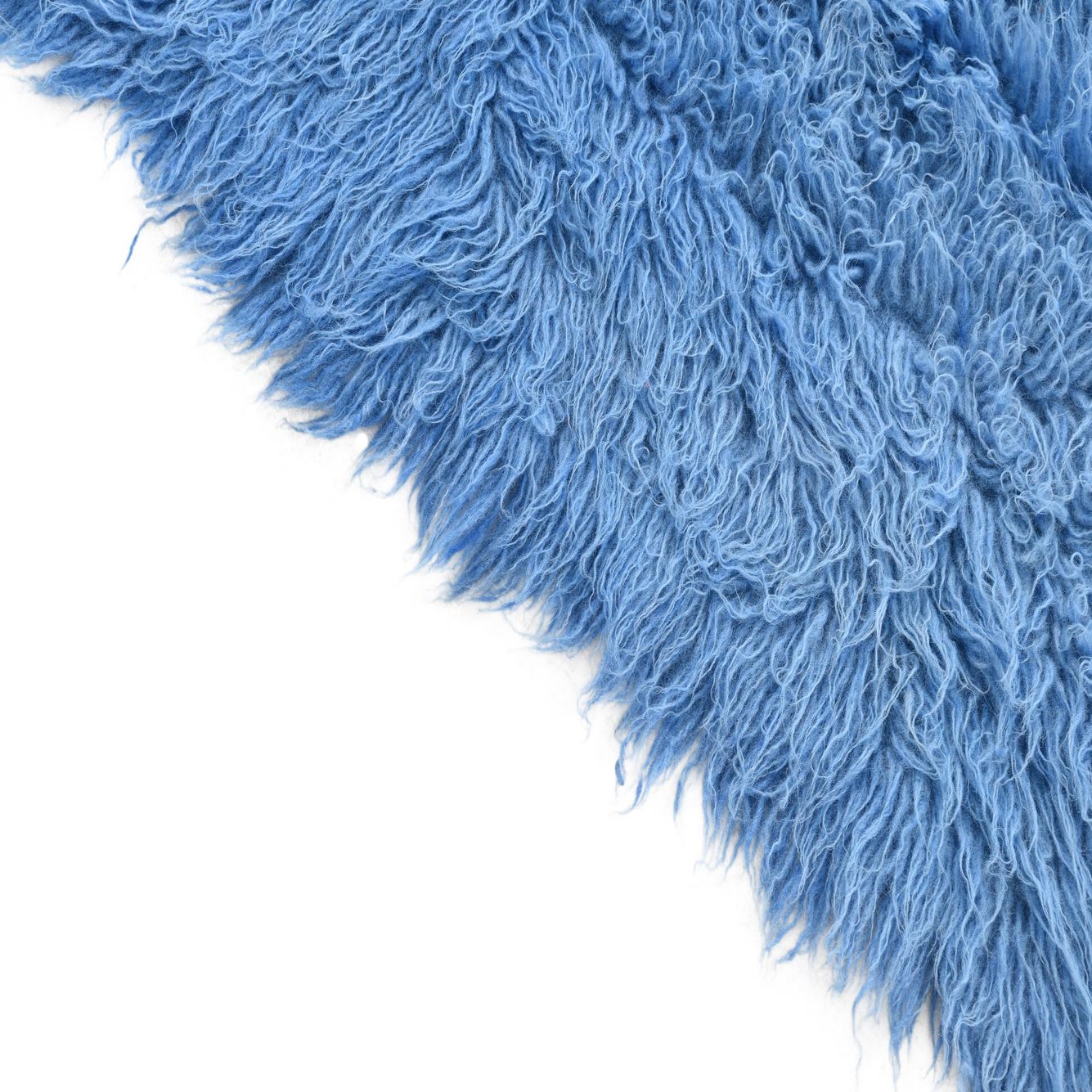Hand-knotted in 100% wool, this rug has a long, shaggy pile that invites touch and adds instant depth to a room. The surface is formed by dense, curly wool strands that create an organic, irregular texture rather than a strict pattern; a subtle central channel gives the piece a sculptural line down its length. The background is blue, with tonal variation from deeper cobalt to lighter blue highlights that create visual movement across the pile.