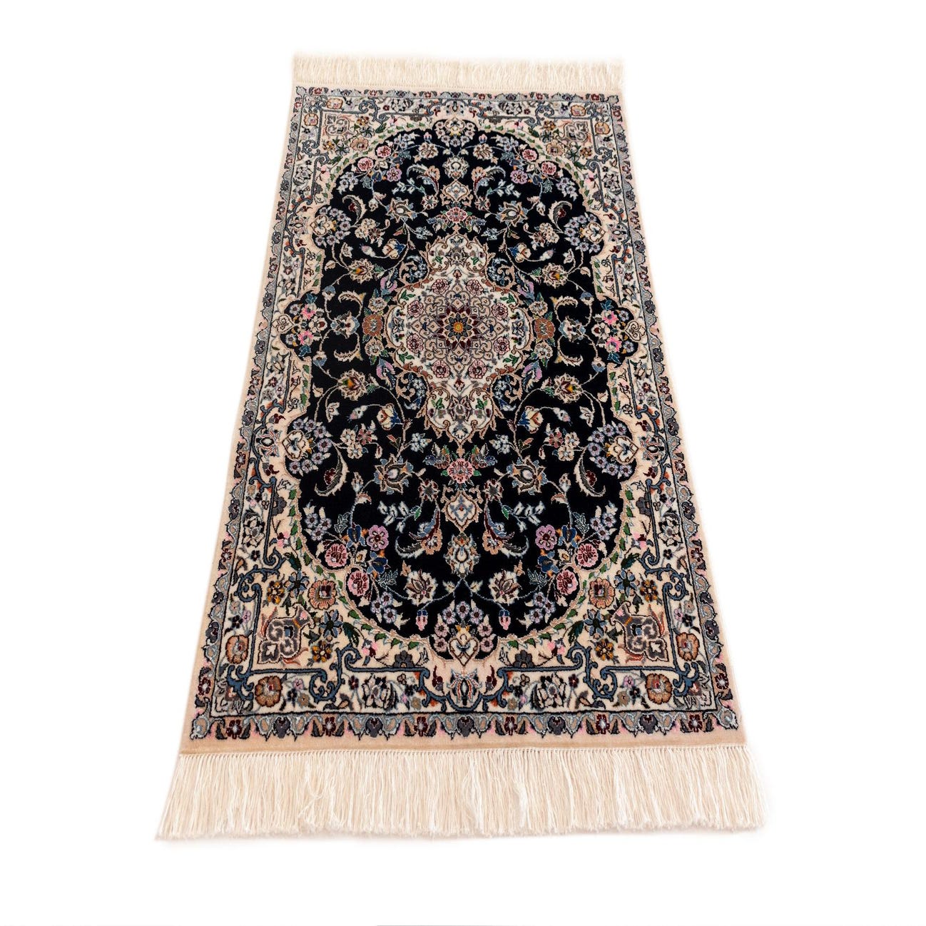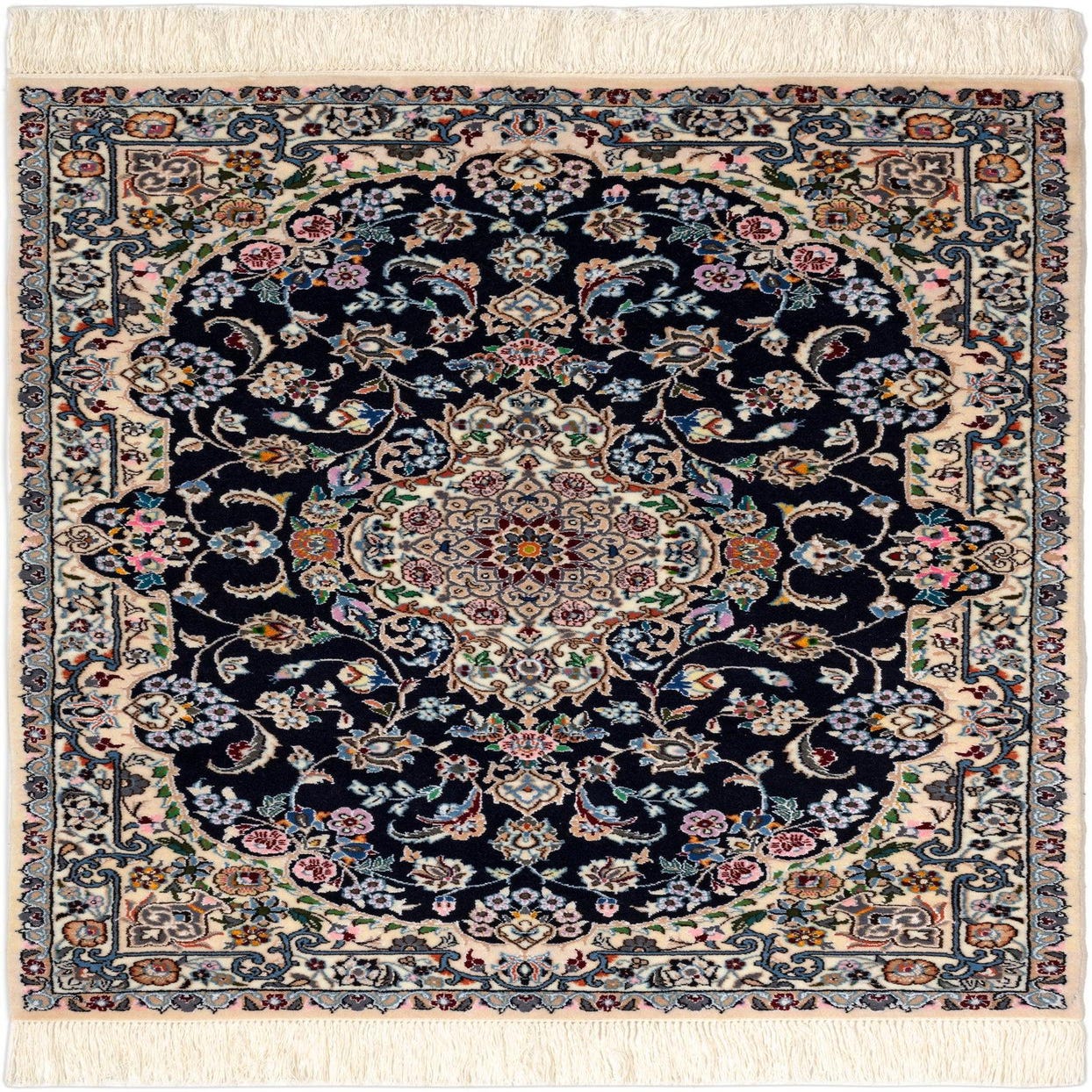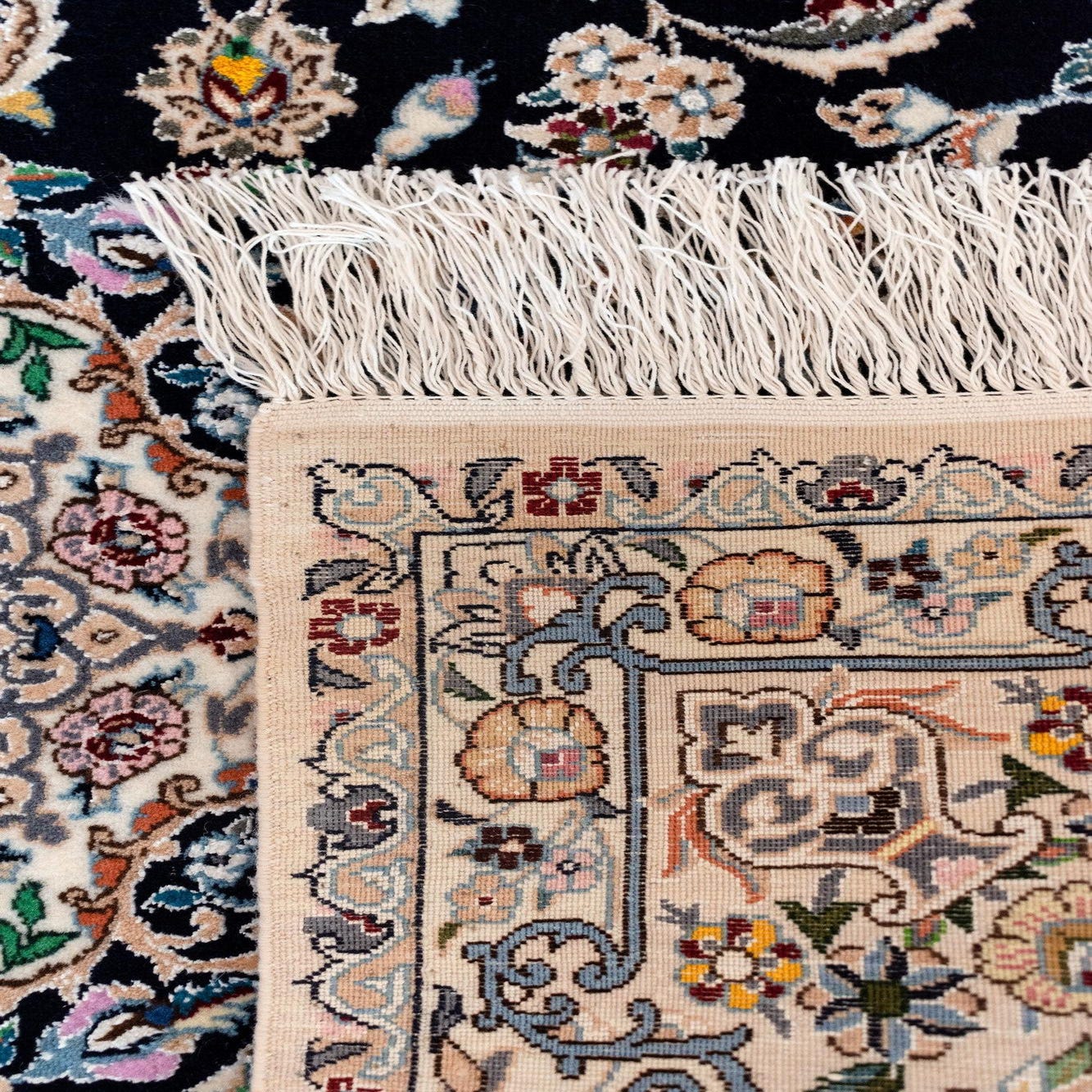 A 3x4 rectangular Persian rug with a dark blue field, intricate floral patterns, and a cream border, featuring a central medallion.