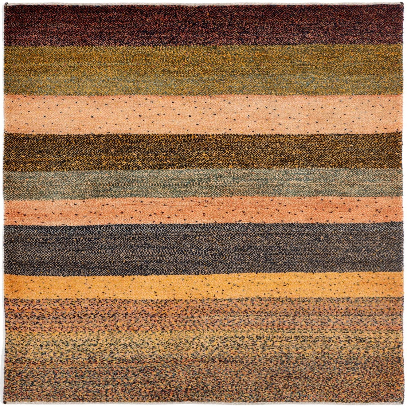 A rectangular 3x5 Amaleh Persian rug featuring horizontal stripes in shades of blue, brown, and peach, handmade from wool.