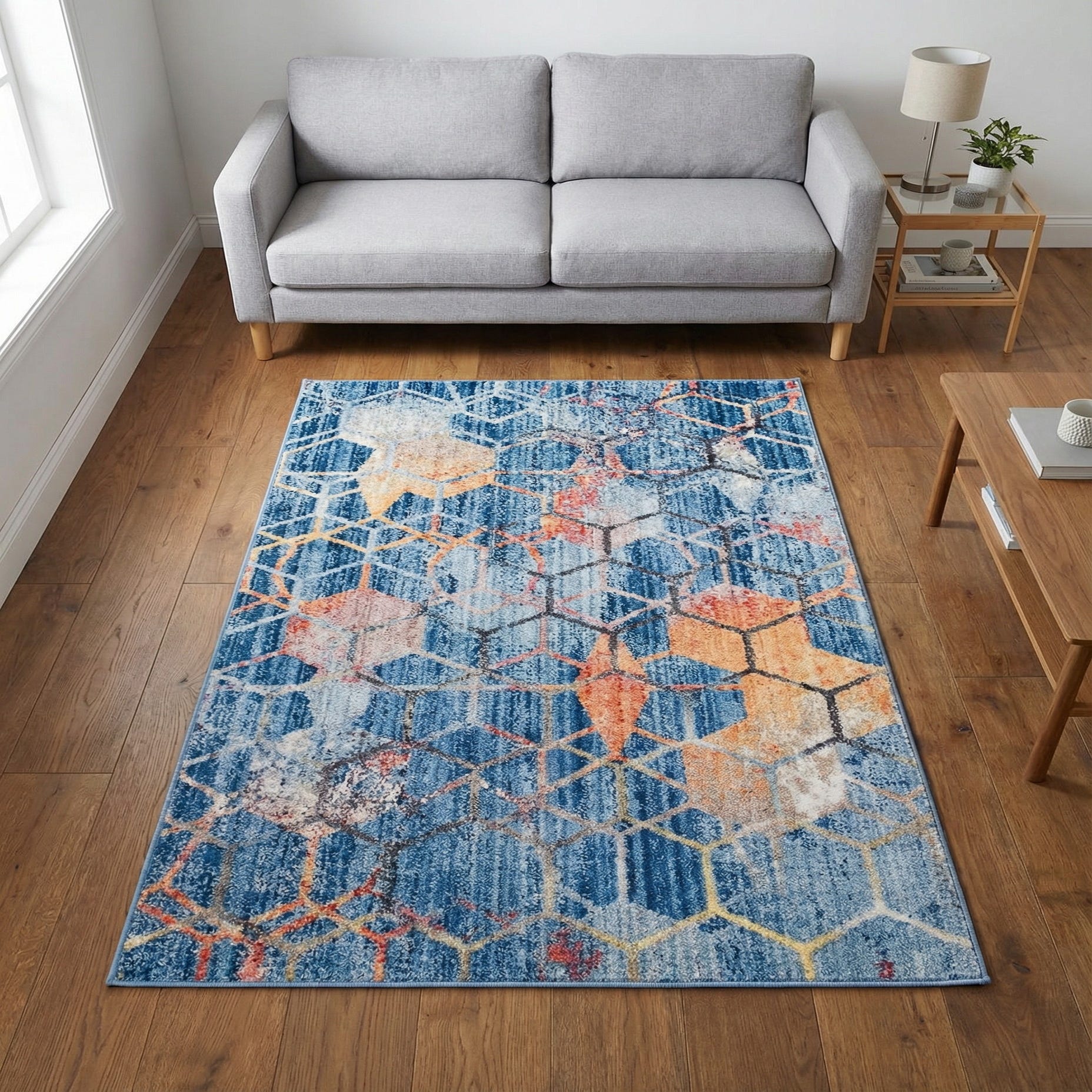 Primary color is Blue. Colors in this rug include: Blue, Beige, Gold, Navy Blue, Orange, Peach.