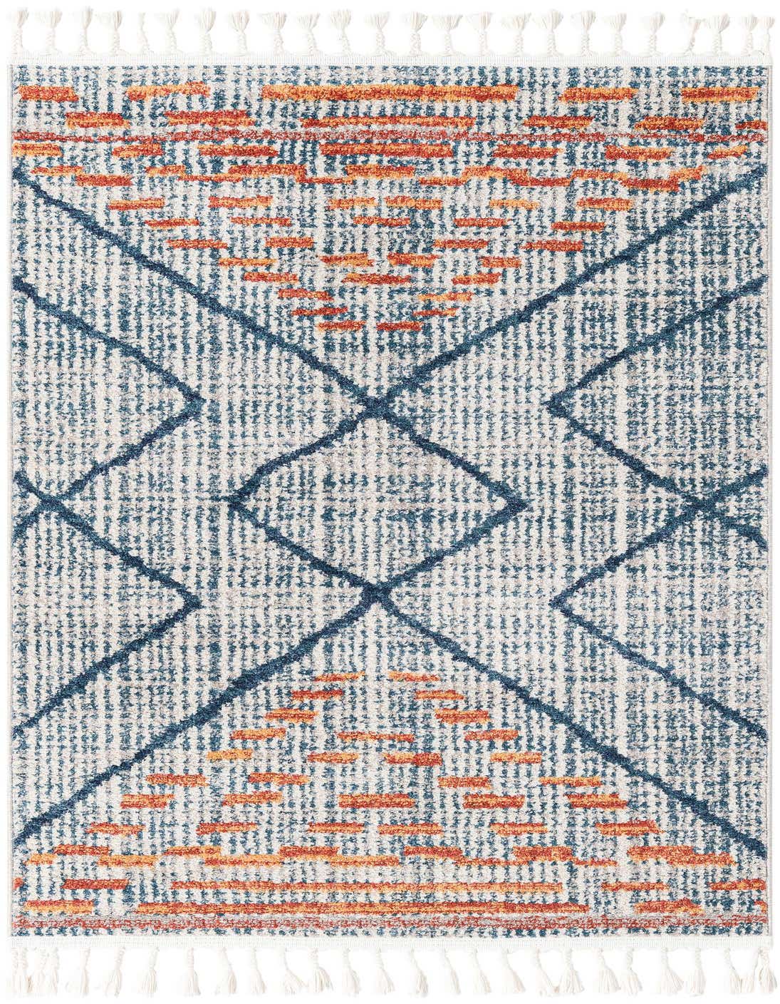 Primary color is Blue. Colors in this rug include: Blue, Black, Ivory, Terracotta.