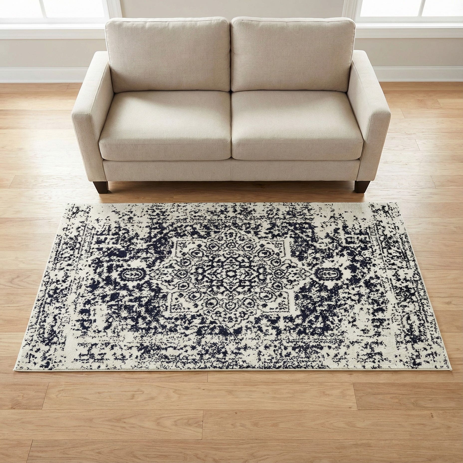 A softly distressed medallion pattern sits against a deep blue field, the ivory motifs mapped out in a faded, vintage-inspired layout that gives the rug a lived-in character. The traditional medallion and border elements are broken up by speckled areas and worn edges for a timeworn effect that reads modern and relaxed. Machine made of 100% polypropylene, the rug has a low, dense pile that feels smooth underfoot with a subtle texture where the ivory design contrasts against the blue background.