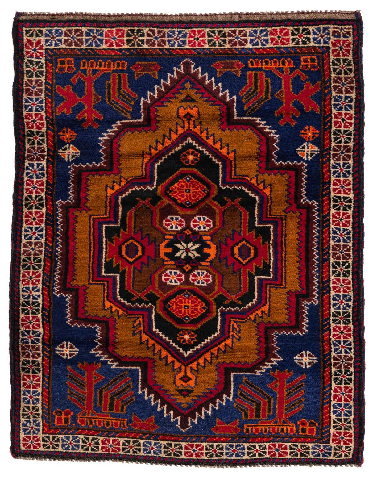 Primary color is Blue. Colors in this rug include: Blue, Black, Burgundy, Ivory, Orange, Maroon.