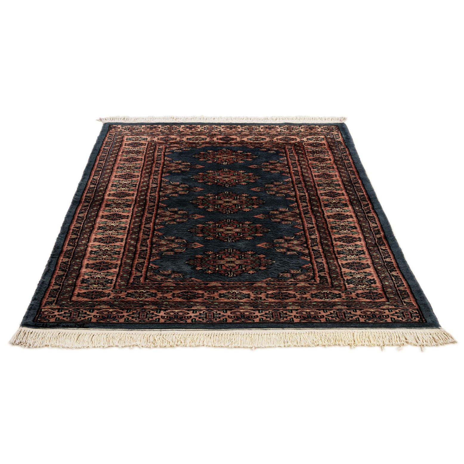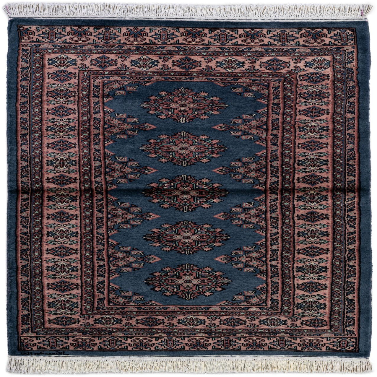 A 3x5 rectangular Bokhara rug in shades of blue with intricate tribal and traditional patterns in pink and red, featuring a flat pile.