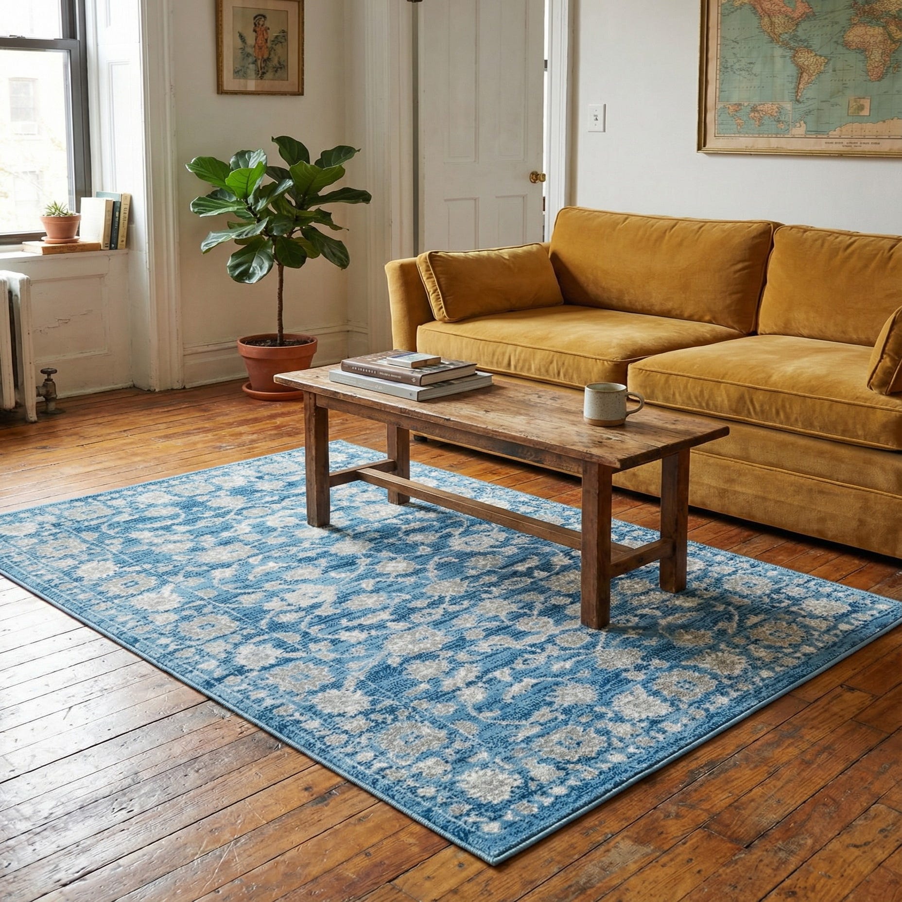 A softly distressed floral-medallion design brings classic character to a blue ground, with ivory and gray motifs tracing scrolling vines and rosettes across a defined border. The pattern balances traditional ornament with a slightly worn effect, creating visual depth without heavy contrast. Machine-made from 55% polypropylene and 45% polyester, the rug has a smooth, low-to-medium pile with a bit of sheen from the polyester that feels soft underfoot while holding pattern definition.