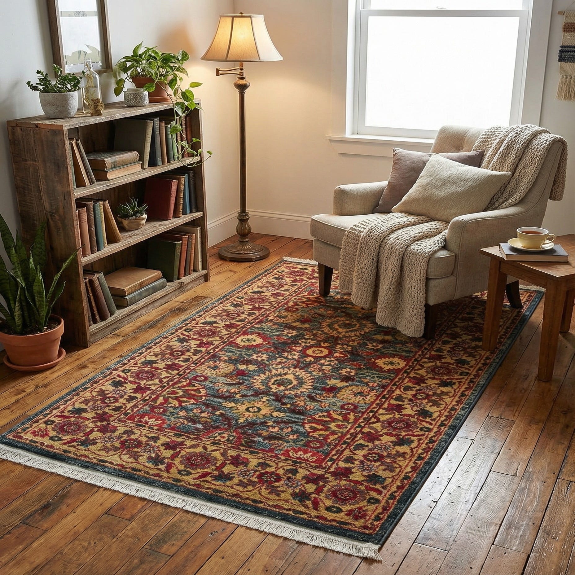Machine made from 100% polypropylene, the rug has a low, tightly woven pile that feels smooth and slightly cushioned underfoot and holds its pattern definition well. It works nicely in entryways or hallways, at the foot of a bed or in front of a sofa, and pairs easily with warm wood furniture, leather seating, or painted cabinetry in cream, olive or navy. The combination of cool blue background and warm beige and red accents makes it an adaptable anchor for both traditional and transitional interiors.