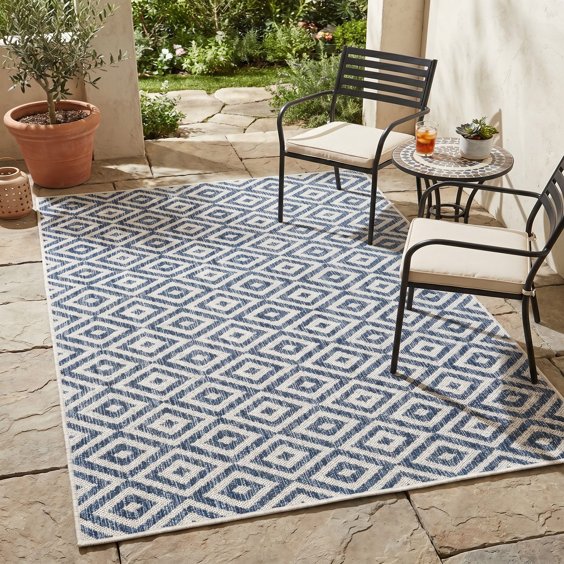This suited my needs perfectly for a little outdoor breakfast area. The pattern mimics my garden lattice pattern. These photos were taken at night but it shows up well. Dries out quickly after rain
