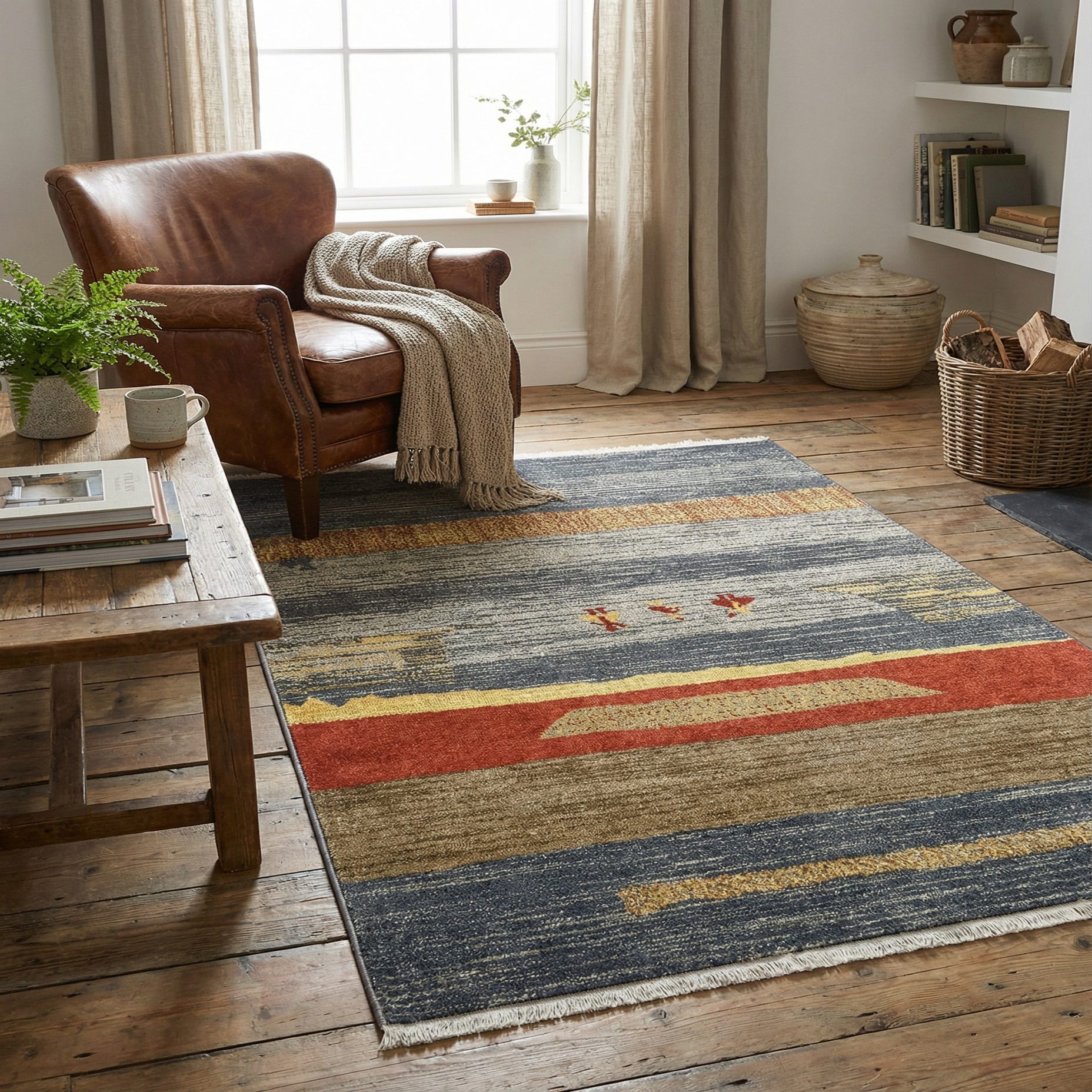 This rug works well in contemporary, mid-century, or casually layered interiors. Use it to anchor a small seating area or entryway, pair it with warm wood furniture and neutral upholstery to let the blue and red accents stand out, or add it to an eclectic office or playroom where its pattern introduces color and character.