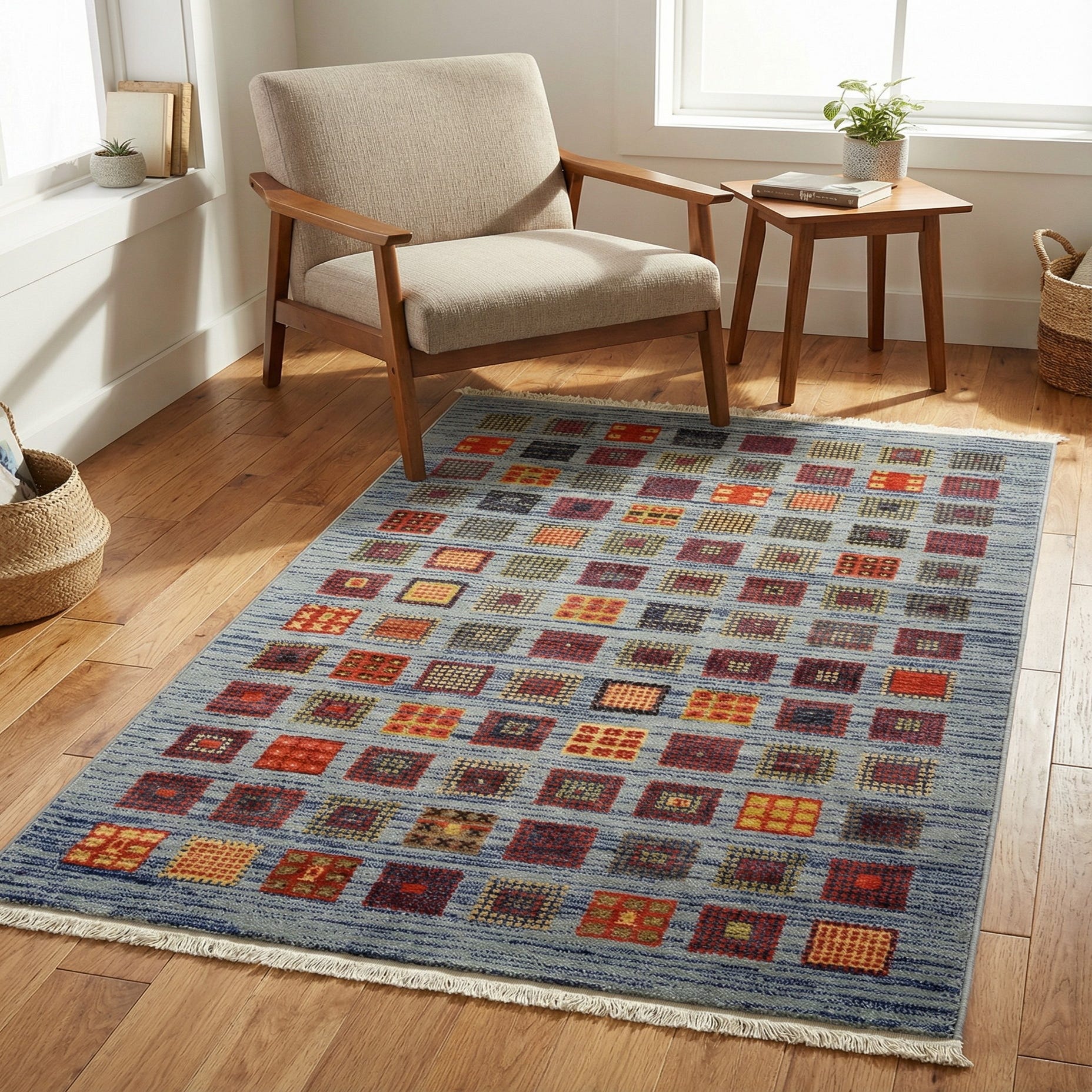 A structured grid of small square motifs sits on a cool blue ground, each square worked in a mix of red, tan, olive, navy and brown. The pattern alternates tiny checkerboard and dotted motifs, creating a lively, ordered repeat across the field. Fine horizontal striations in deeper navy thread the blue background, giving the surface a gentle, hand-loomed look while the short fringe at each end frames the design.