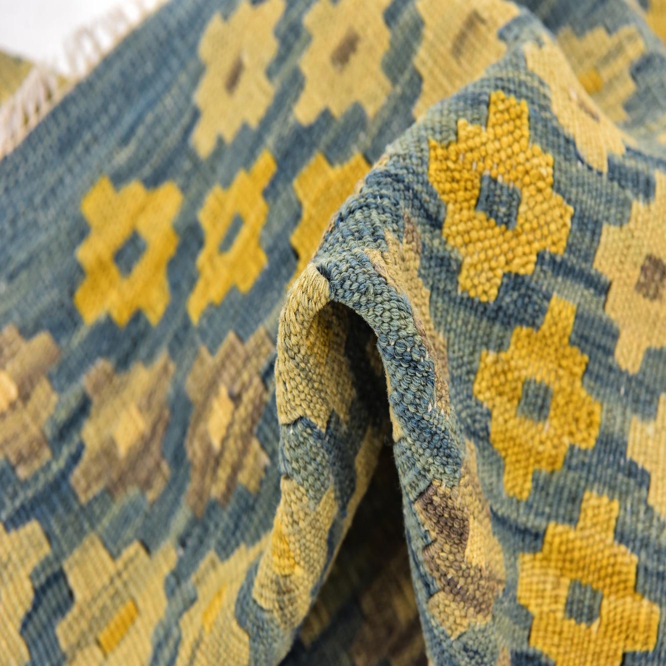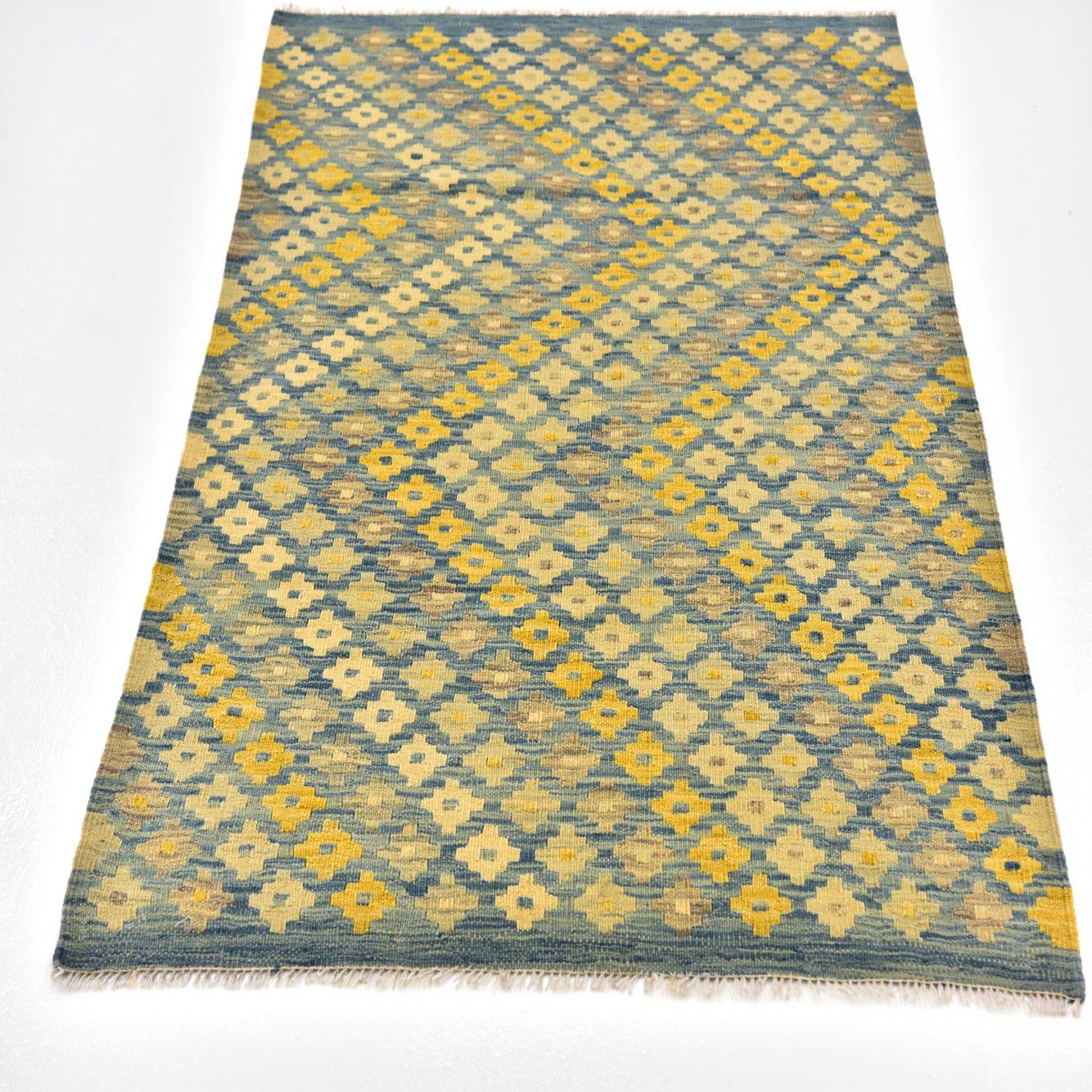 A 3x5 rectangular blue flatweave rug with a repeating geometric pattern in shades of blue, yellow, and beige.