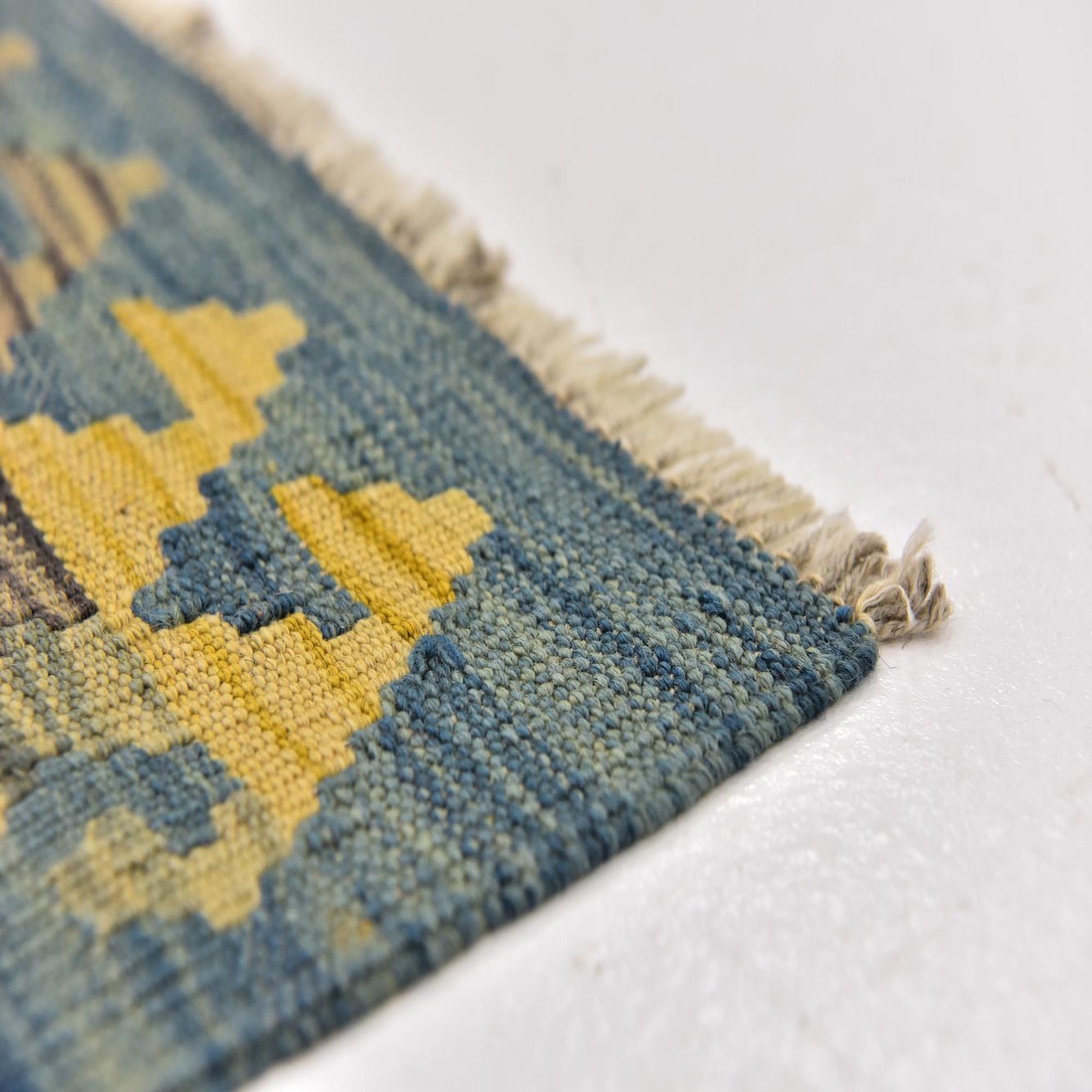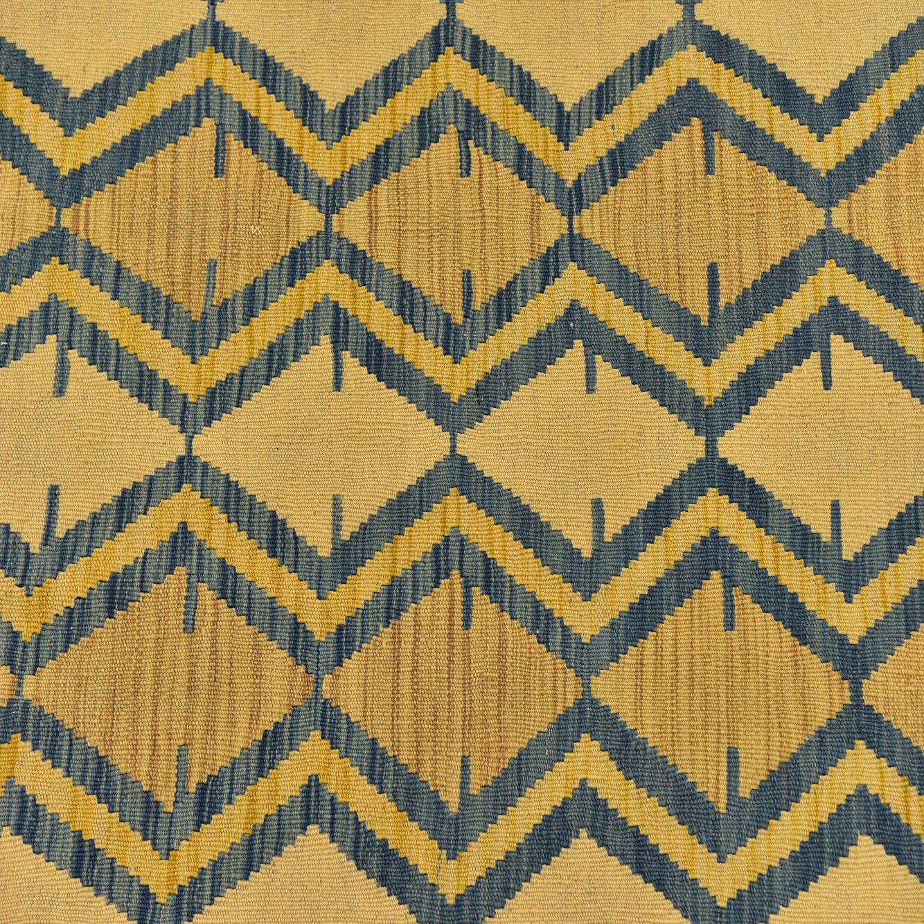 The Kilim Modern collection presents a 3x5 hand-woven rug crafted from 100% wool, offering durability and a soft texture underfoot. The design features a geometric pattern with diamond and angular shapes that create a contemporary and structured aesthetic. The color palette includes a harmonious blend of blue, beige, brown, and yellow hues, with the blue background providing a rich canvas for the pattern to stand out.