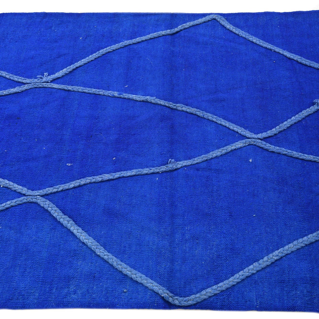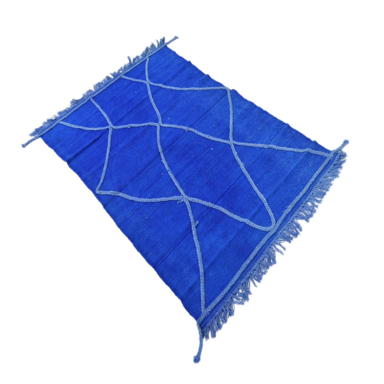 A 3x5 rectangular blue tribal flatweave wool rug with a lighter blue geometric diamond pattern and fringed ends.