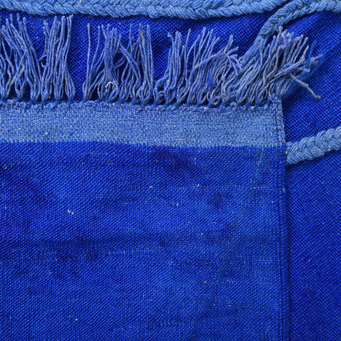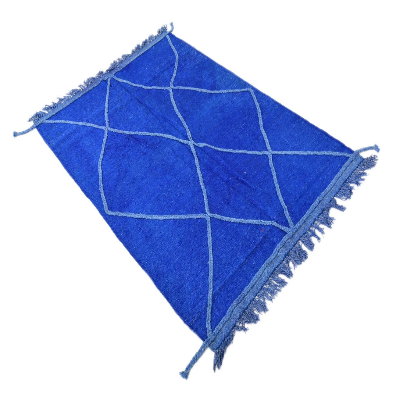 The Kilim Modern collection presents a hand-woven 3x5 rug crafted from 100% wool, offering both durability and a tactile experience. This rug features a bold, blue background with an understated geometric pattern that creates a sense of depth and texture. The simplicity of its design is accentuated by the lighter blue lines that form diamond-like shapes across the surface, giving it a contemporary yet timeless appeal.