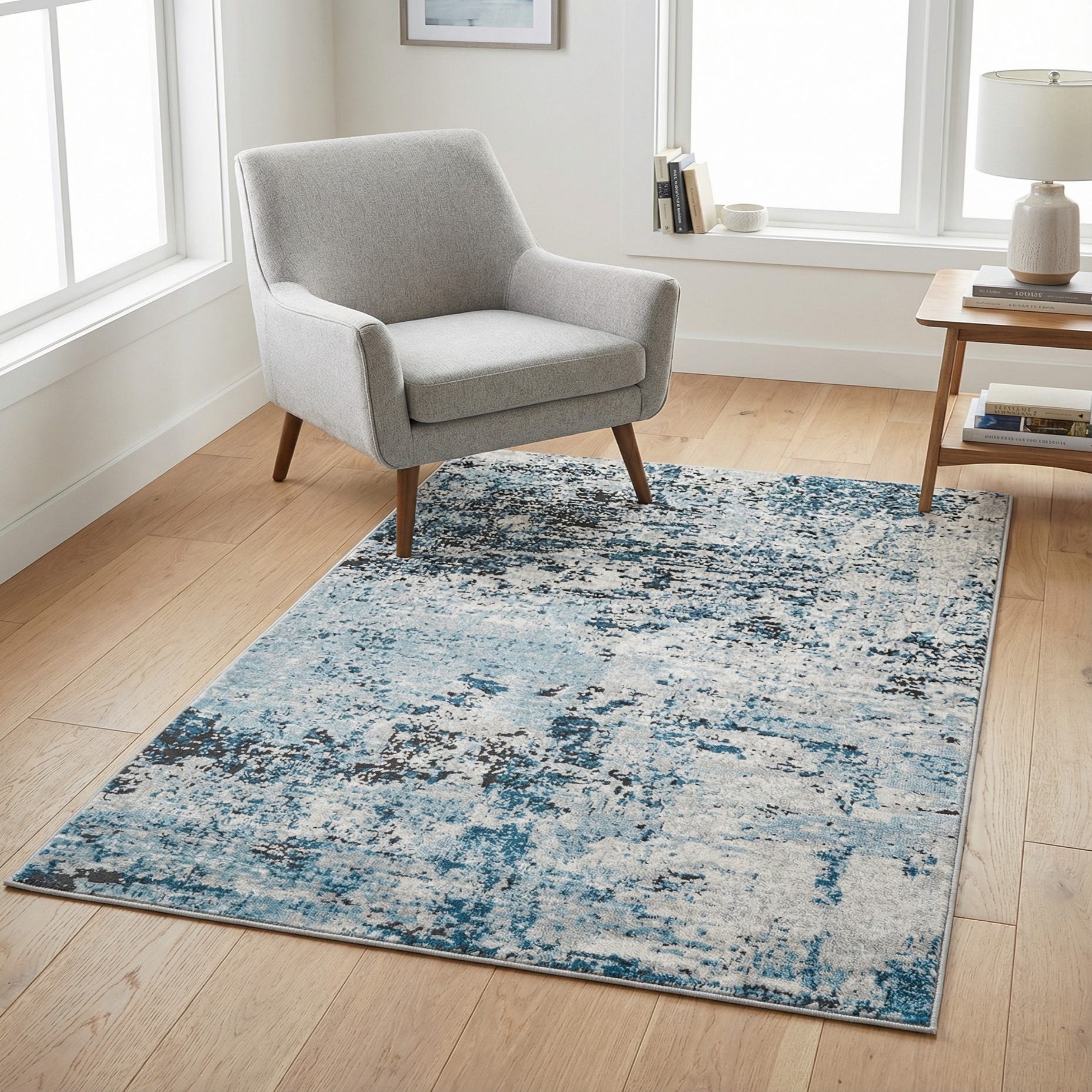 A modern, abstract field of color sits on a blue background, where irregular washes of ivory, light blue and gray create a painterly, distressed effect. The pattern feels layered and organic, with scattered flecks and soft-edged shapes that give visual movement without a strict repeat. Run your hand across the low-profile pile and you’ll notice a soft, slightly lustrous texture created by the blend of yarns; the surface has subtle depth from the mixed tones and tightly woven construction.