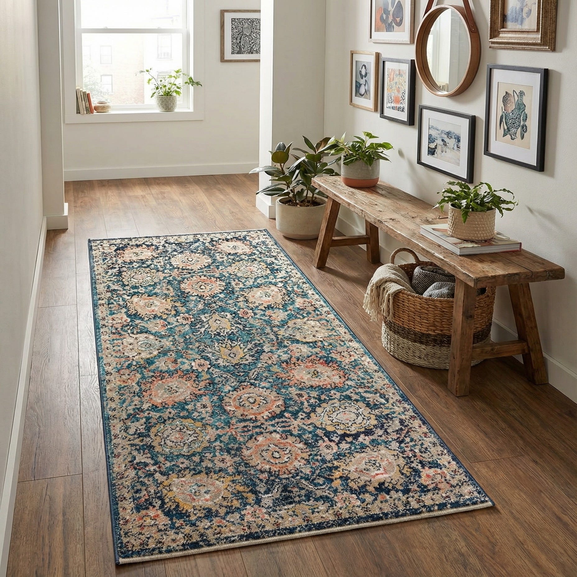 Place this rug in a small living room seating area or beside a bed to add color and pattern without overwhelming the space. It also works well in an entry or reading nook, or layered under a compact coffee table. Pair it with warm wood tones and neutral upholstery for a balanced transitional scheme, with navy or gray sofas for a coordinated palette, or mix it into a bohemian or cottage-style room for an eclectic, collected look.