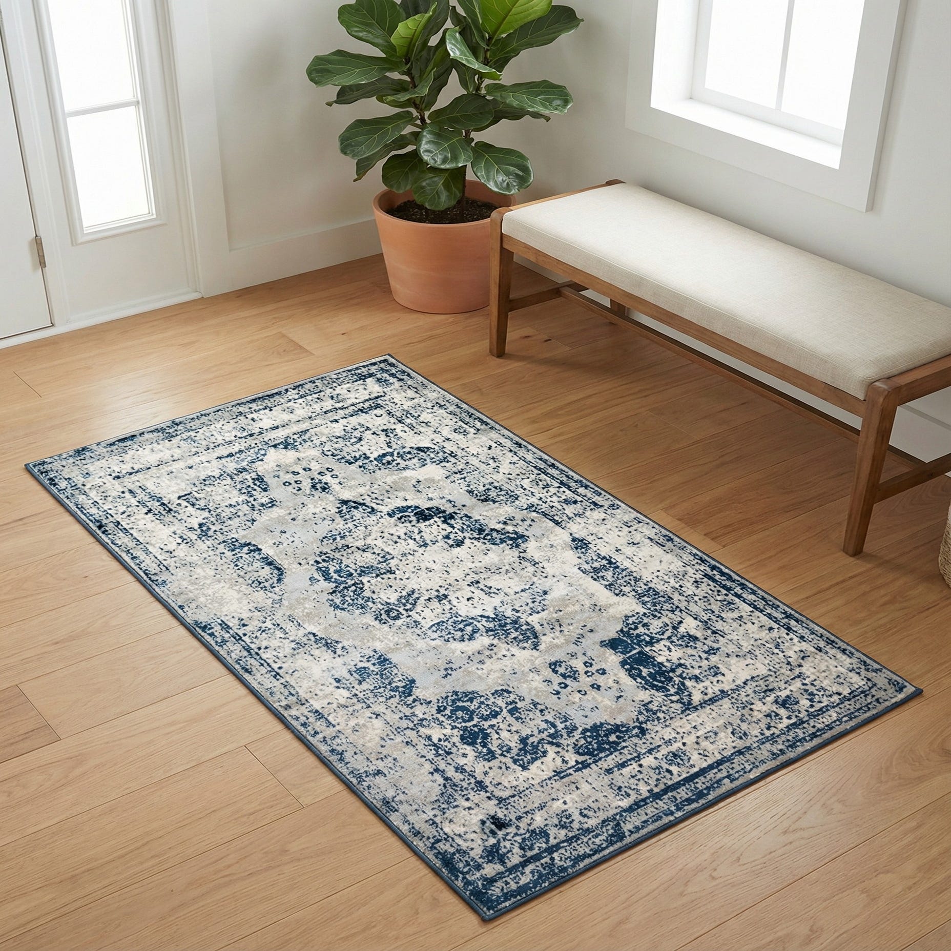 With its stain-resistant and shed-free properties, the rug lends itself well to high-traffic areas, offering ease of maintenance and longevity. Perfect for anchoring living spaces with a touch of elegance, this rug complements a variety of decor styles, from contemporary to traditional. It would particularly shine in settings with neutral tones, where its blue hues can act as a serene focal point, or blend seamlessly into a coastal-themed interior, enhancing the breezy aesthetic of such spaces.