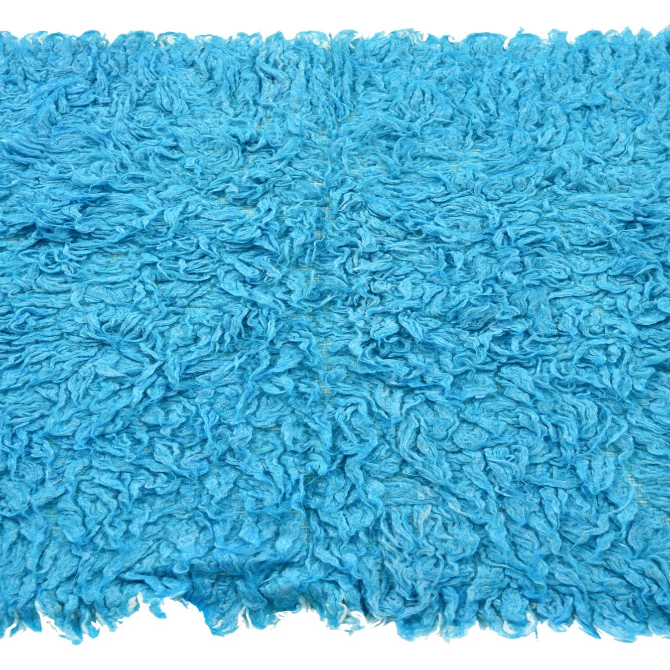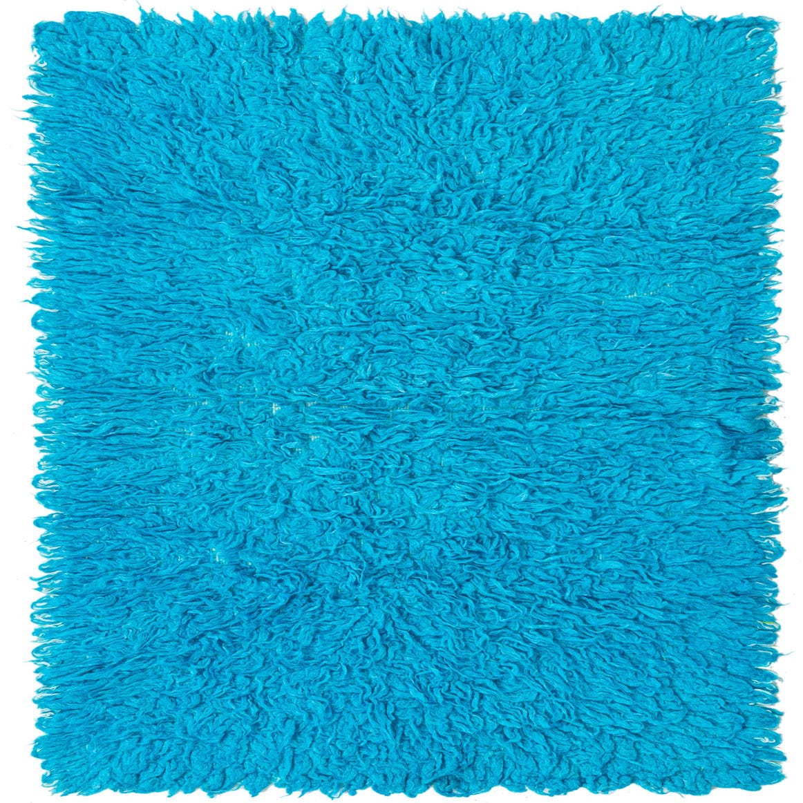 Hand-knotted from 100% wool, this rug is a high-pile, shag-style piece in a bright blue that reads clean and modern. The surface is made up of long, loopy wool strands that form an all-over, tactile field rather than a defined motif; running your hand across it reveals a soft, dense pile with subtle variations in height that catch light and create gentle depth. The edges are left slightly irregular by the pile, reinforcing a casual, handcrafted look.