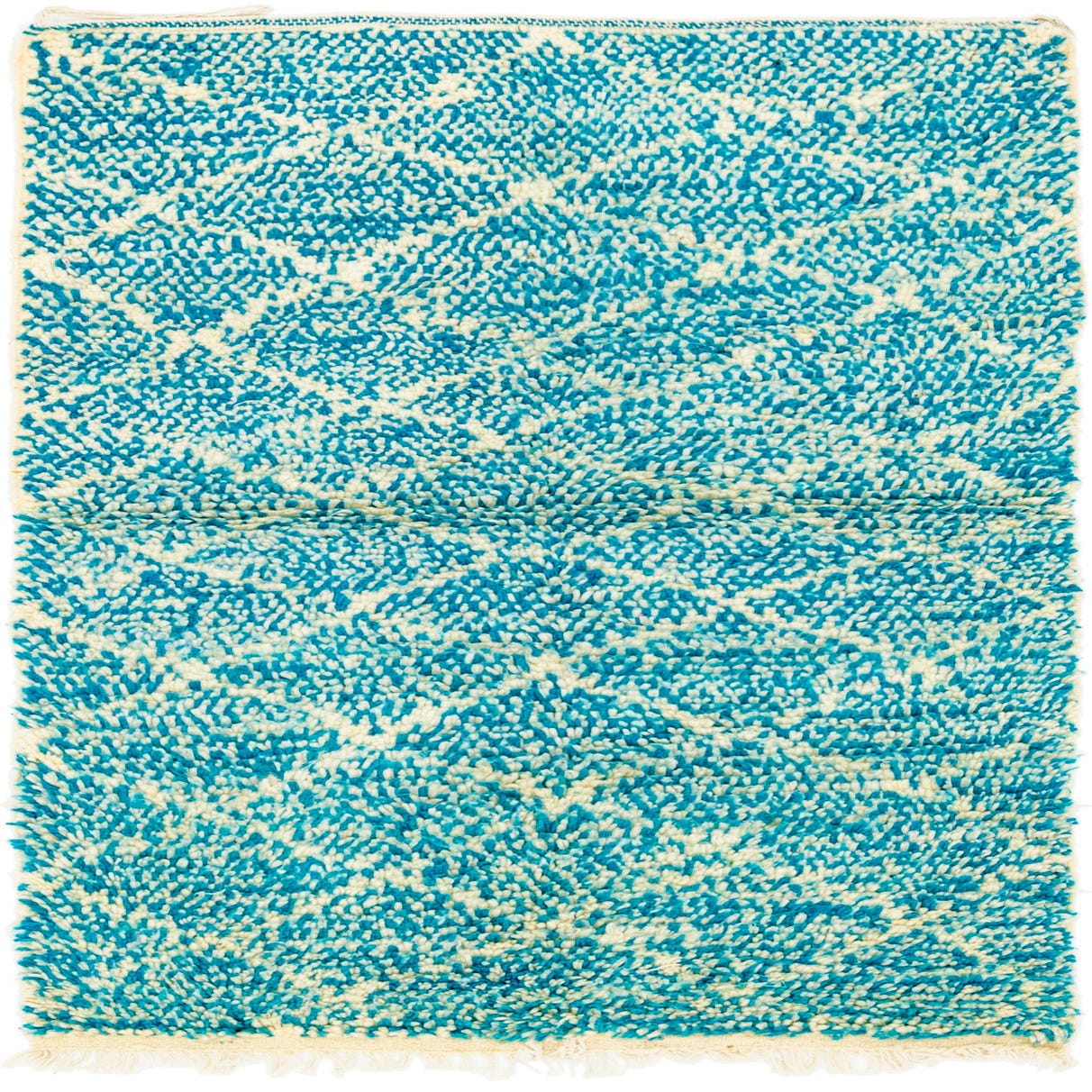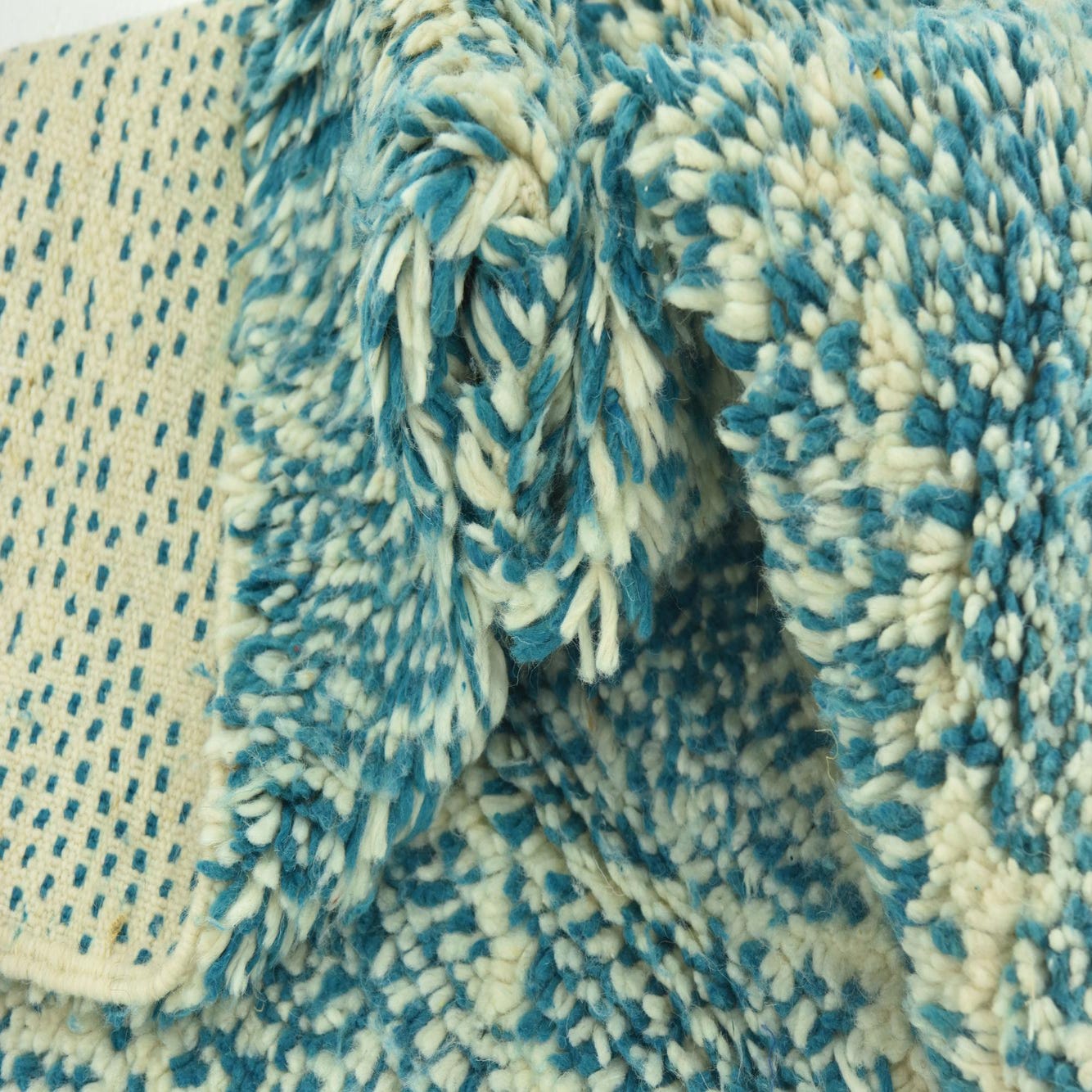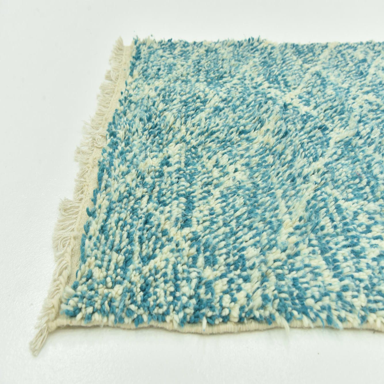 A 3x5 rectangular Moroccan shag rug with a vibrant blue and off-white abstract tribal pattern.