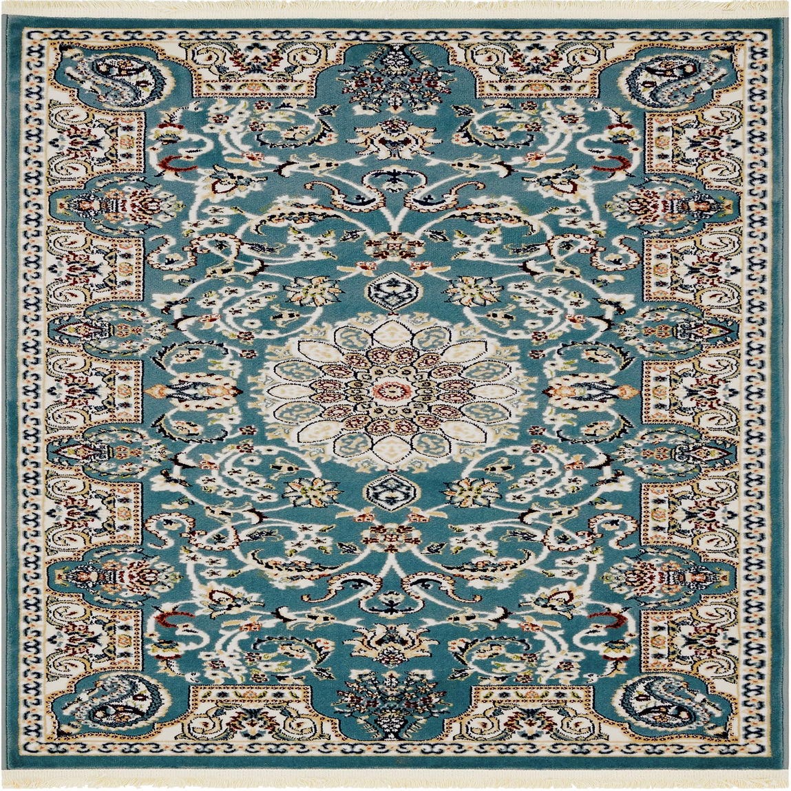 Primary color is Blue. Colors in this rug include: Blue, Beige, Burgundy, Cream, Green, Ivory, Navy Blue, Puce.