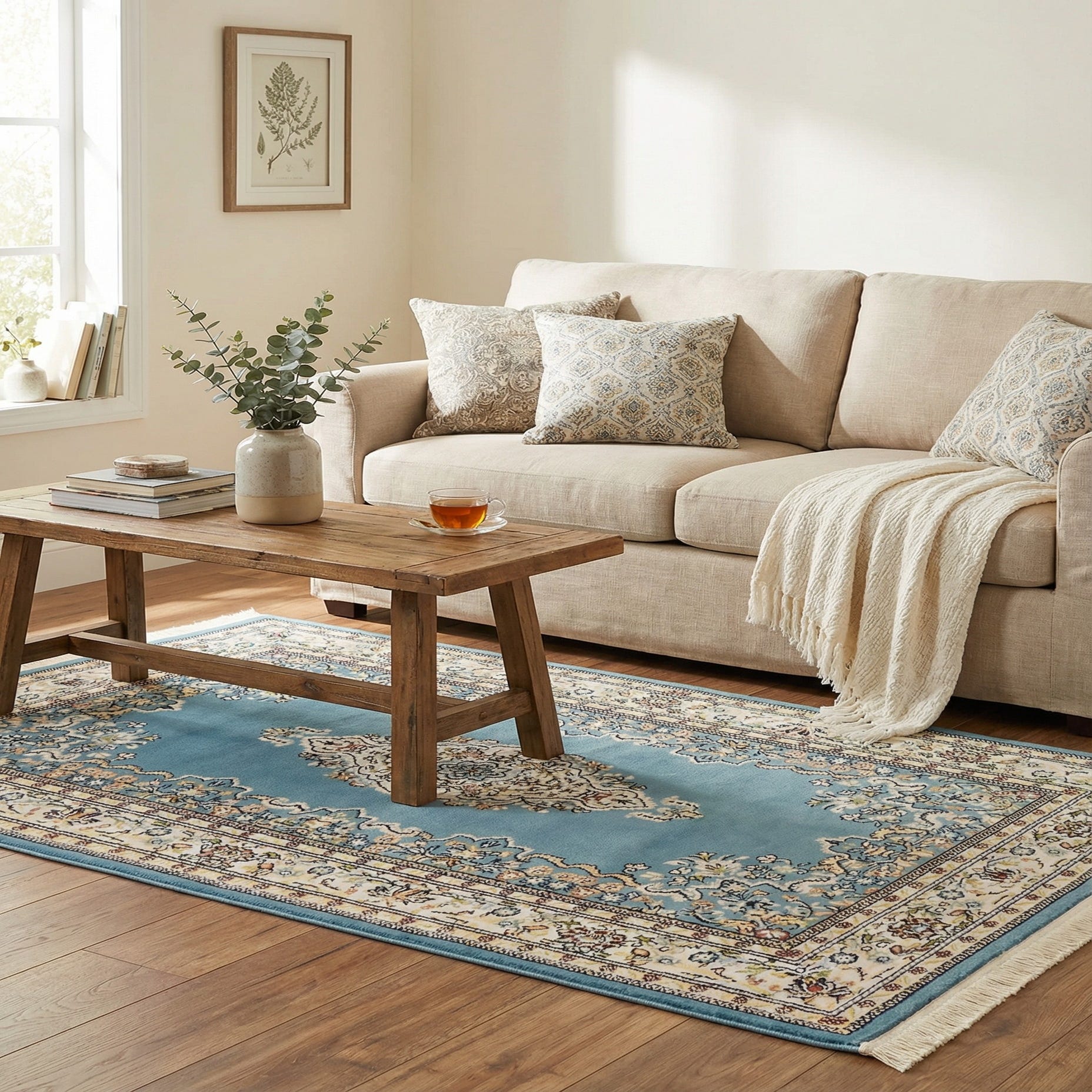 A classic medallion layout gives this rug a traditional, Persian-inspired look with a modern colorway. The blue field provides a calm, even backdrop for a central ivory medallion and intricate floral arabesques that trace the inner zone and inner border. Cream and ivory bands frame the design, while accents of burgundy, plum red, navy blue, green, tan and black add depth and contrast. The surface has a soft, low pile with a slight polyester sheen and a well-defined weave; the rug is machine made from 85% polypropylene and 15% polyester and finished with short fringed ends.
