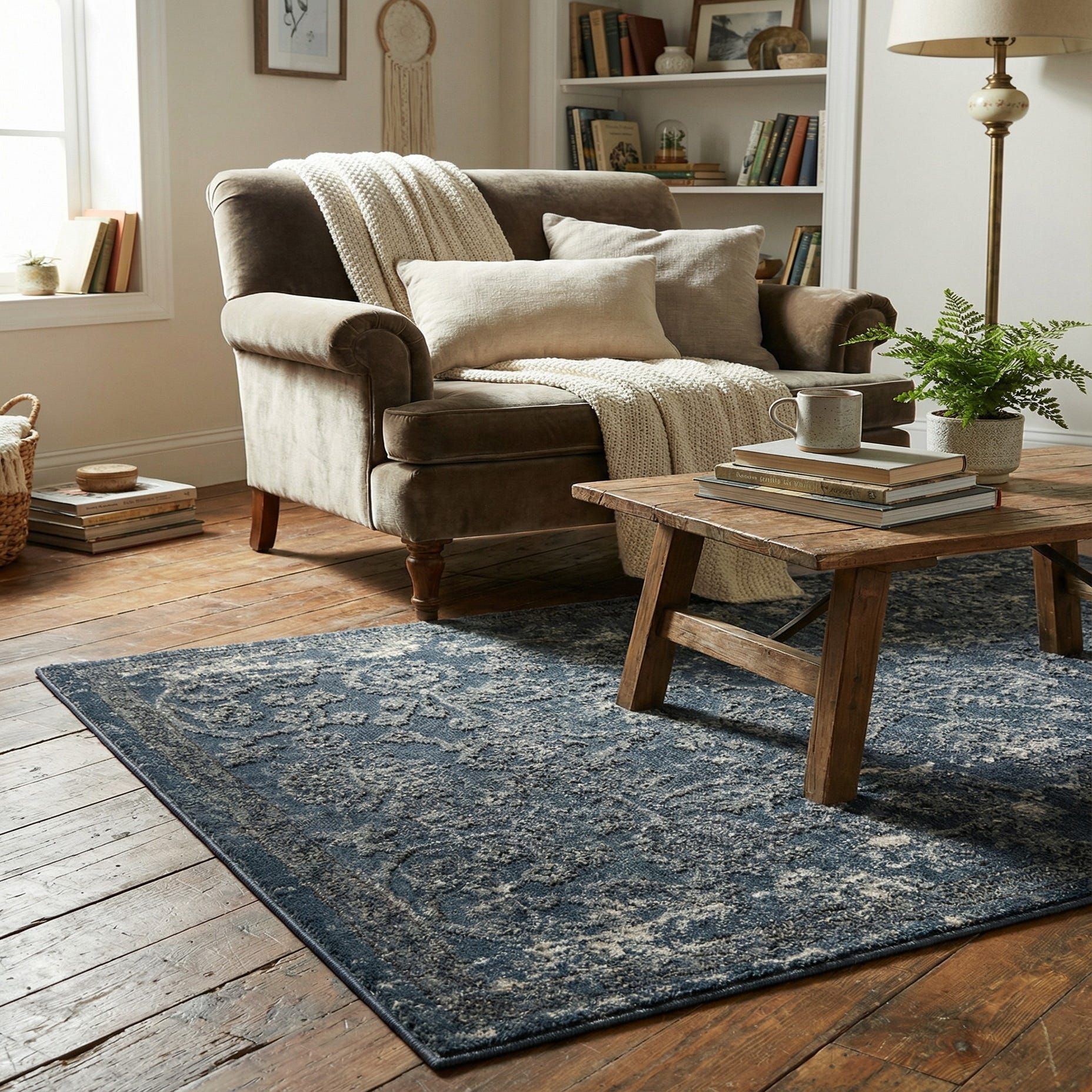Machine-made from 85% polypropylene and 15% polyester, this rug has a low, soft pile that feels smooth underfoot while holding a structured hand. The blue background provides a rich field for an ornamental, slightly distressed floral medallion and scrolling vine pattern in gray and ivory. Subtle pile variation gives the motifs a gentle raised effect, so the ivory and gray highlights catch light against the matte blue for a layered, lived-in look. A narrow border frames the composition and reinforces the traditional sensibility with a modern, faded finish.