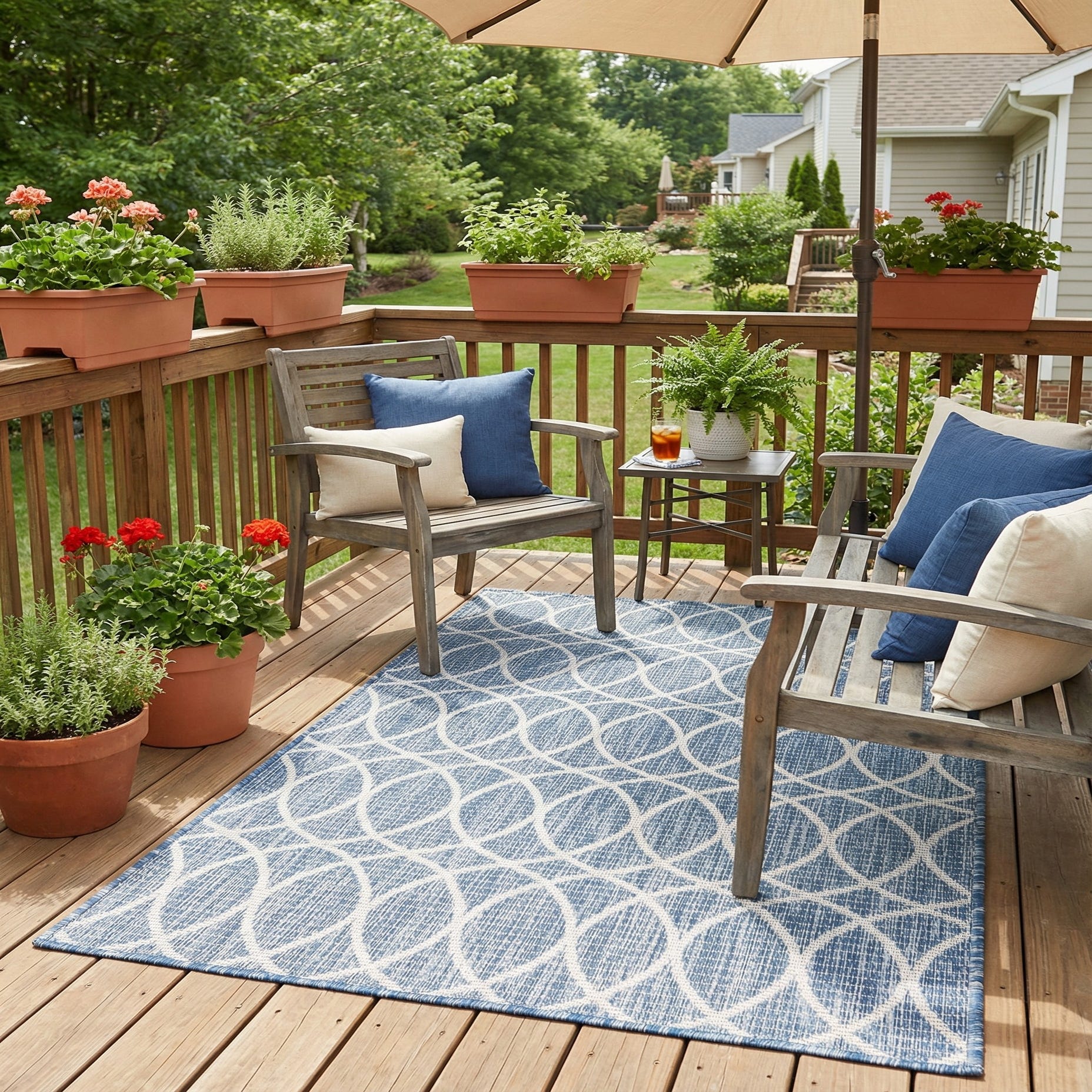 Machine-made from 100% polypropylene, this rug is designed for everyday use in both indoor and outdoor settings. It works well on a covered patio or sunroom paired with natural wicker and light-wood furniture, and it’s a good choice for a coastal, modern-transitional, or casual dining space where crisp blues and whites complement navy or neutral accents. Place it under a bistro set on a balcony, in an entryway to define the space, or layered beneath a simple seating group to add pattern without heaviness.