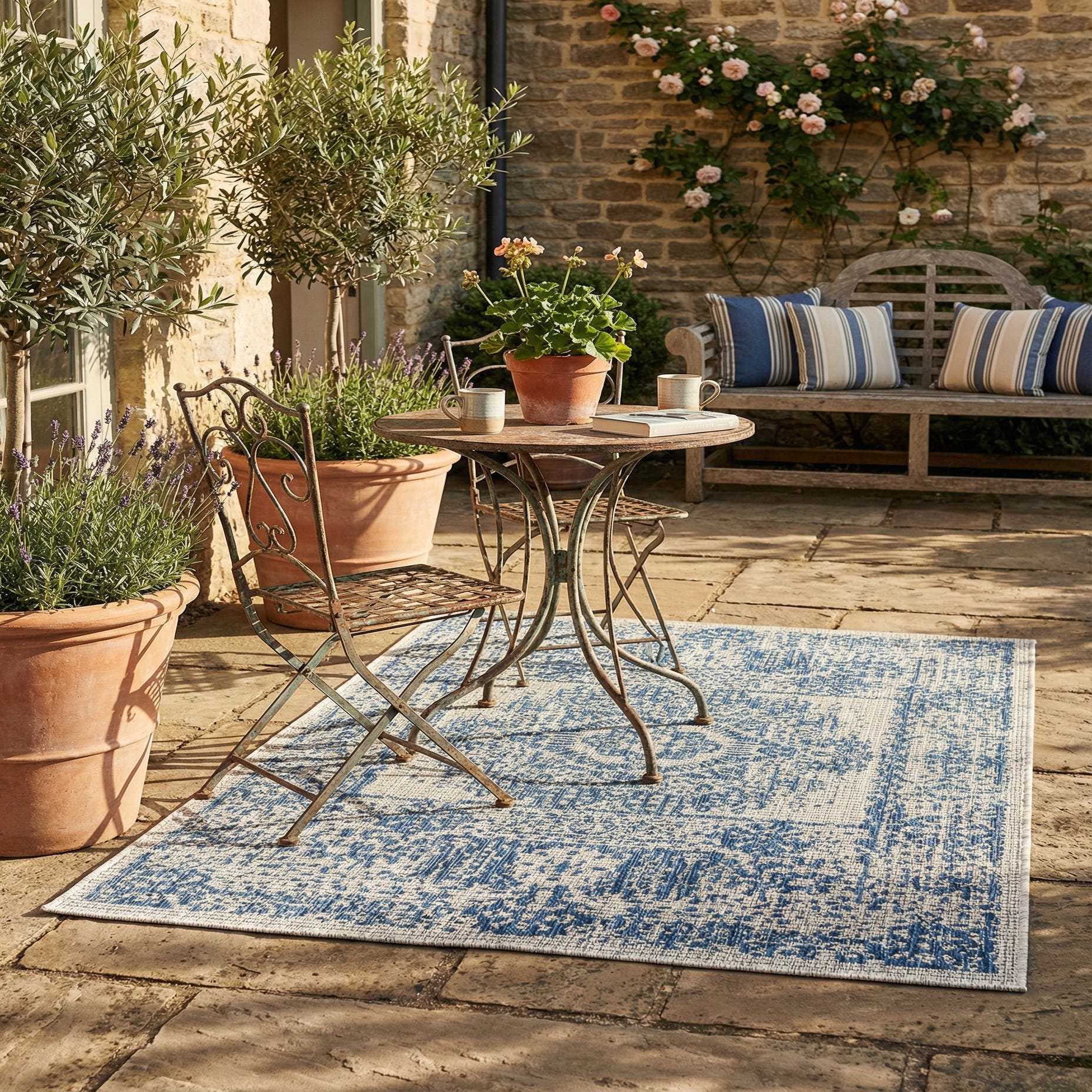 Machine-made from 100% polypropylene, the rug has a low-profile, tightly woven surface with a slightly nubby hand that lies flat underfoot. Its durable construction and traditional outdoor sensibility make it a good fit for a covered patio, entryway, or a small seating area by the door; it also layers nicely in a casual living room or beneath a bistro set. Pair it with light wood furniture and linen textiles for a coastal vibe, or combine with weathered metals and wicker for a relaxed farmhouse or transitional outdoor space.