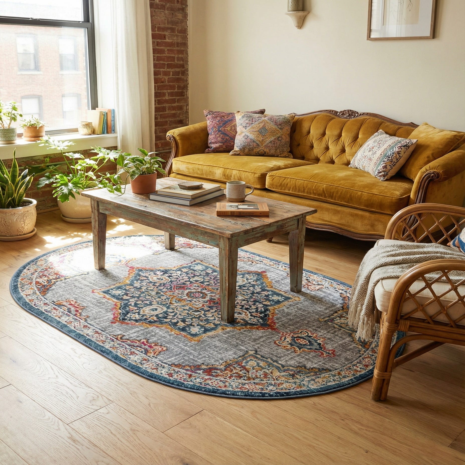 The oval shape works well in smaller entryways or in front of a foyer console, as a grounding piece beneath a round dining table, or layered in a cozy seating nook or bedroom corner. It pairs easily with transitional or traditional decor and can also add color to coastal, eclectic, or modern interiors — try it with navy or ivory upholstery, warm wood tones and brass accents, or use accent pillows and drapery in gold and blush to pick up the rug’s brighter hues.