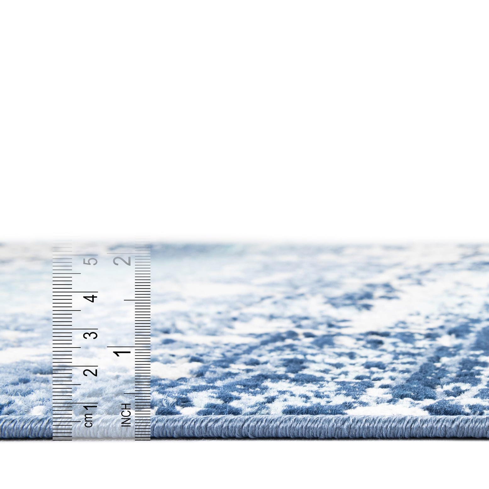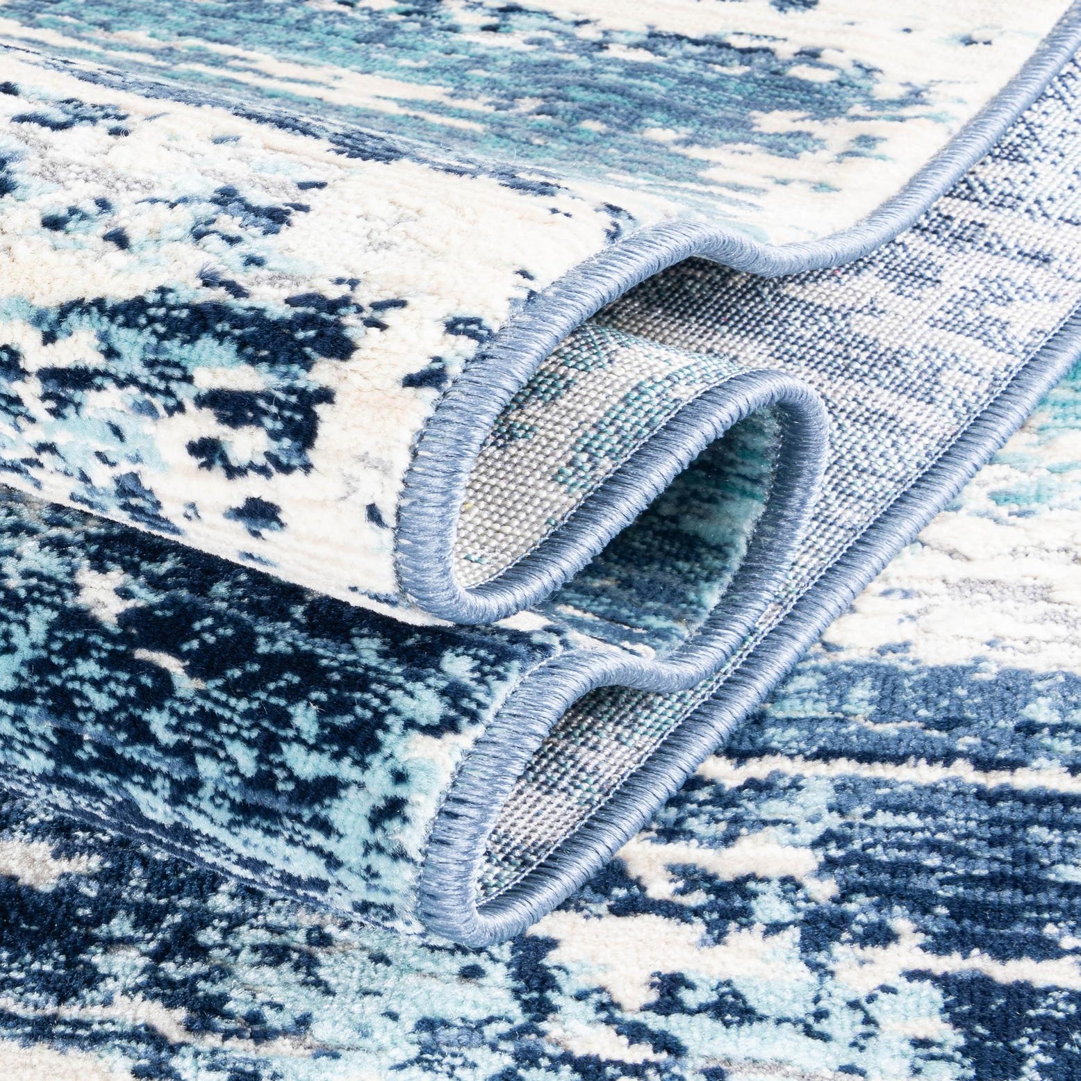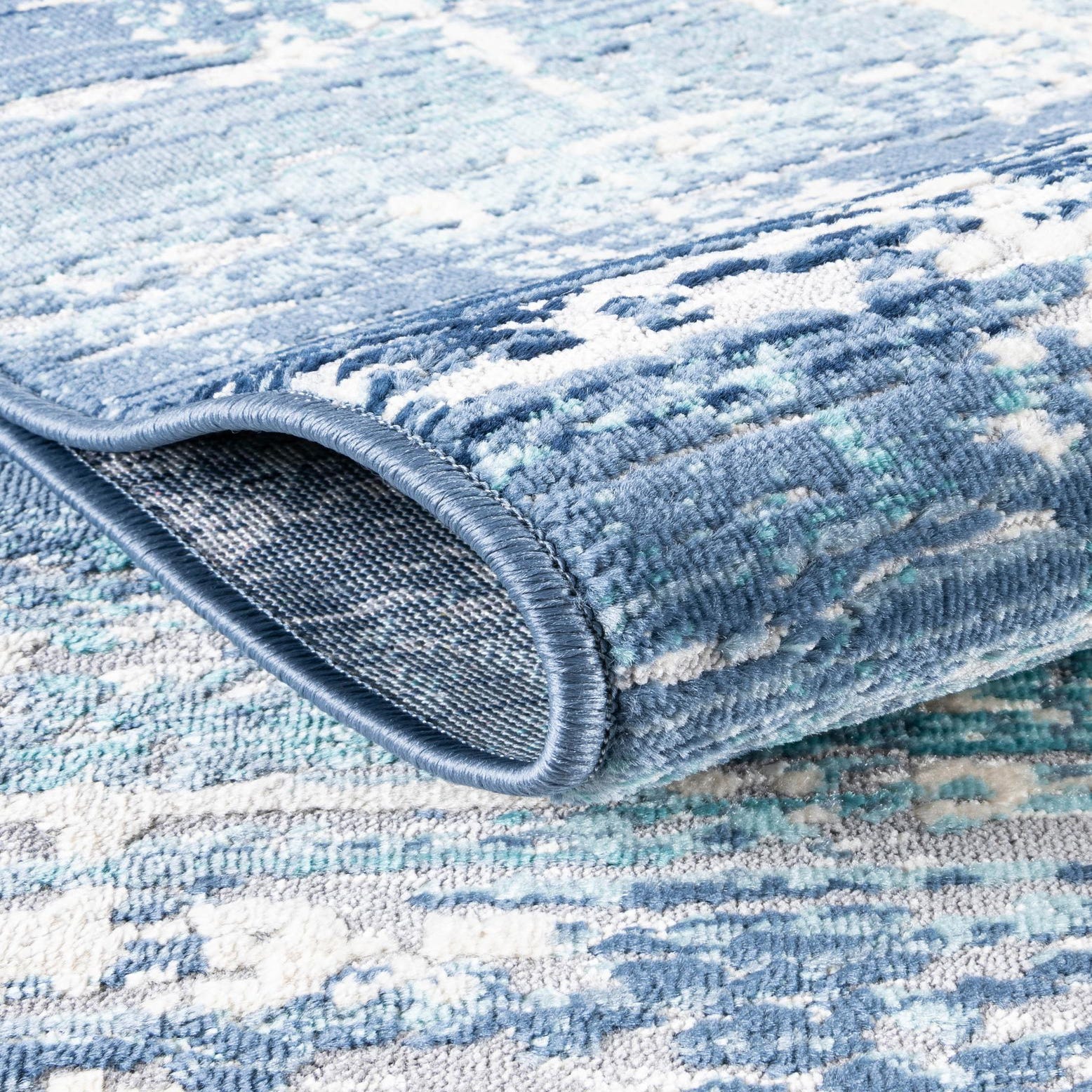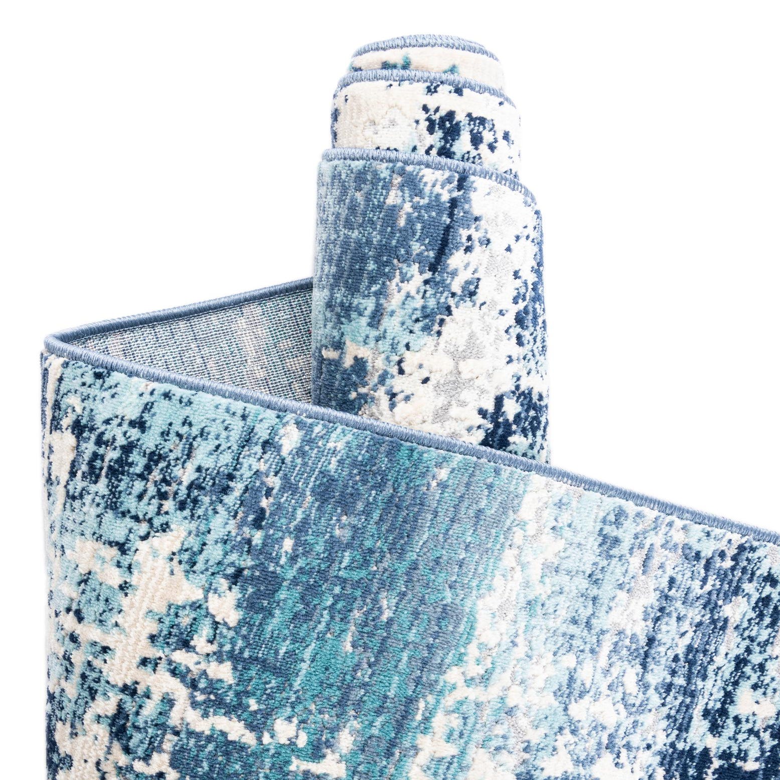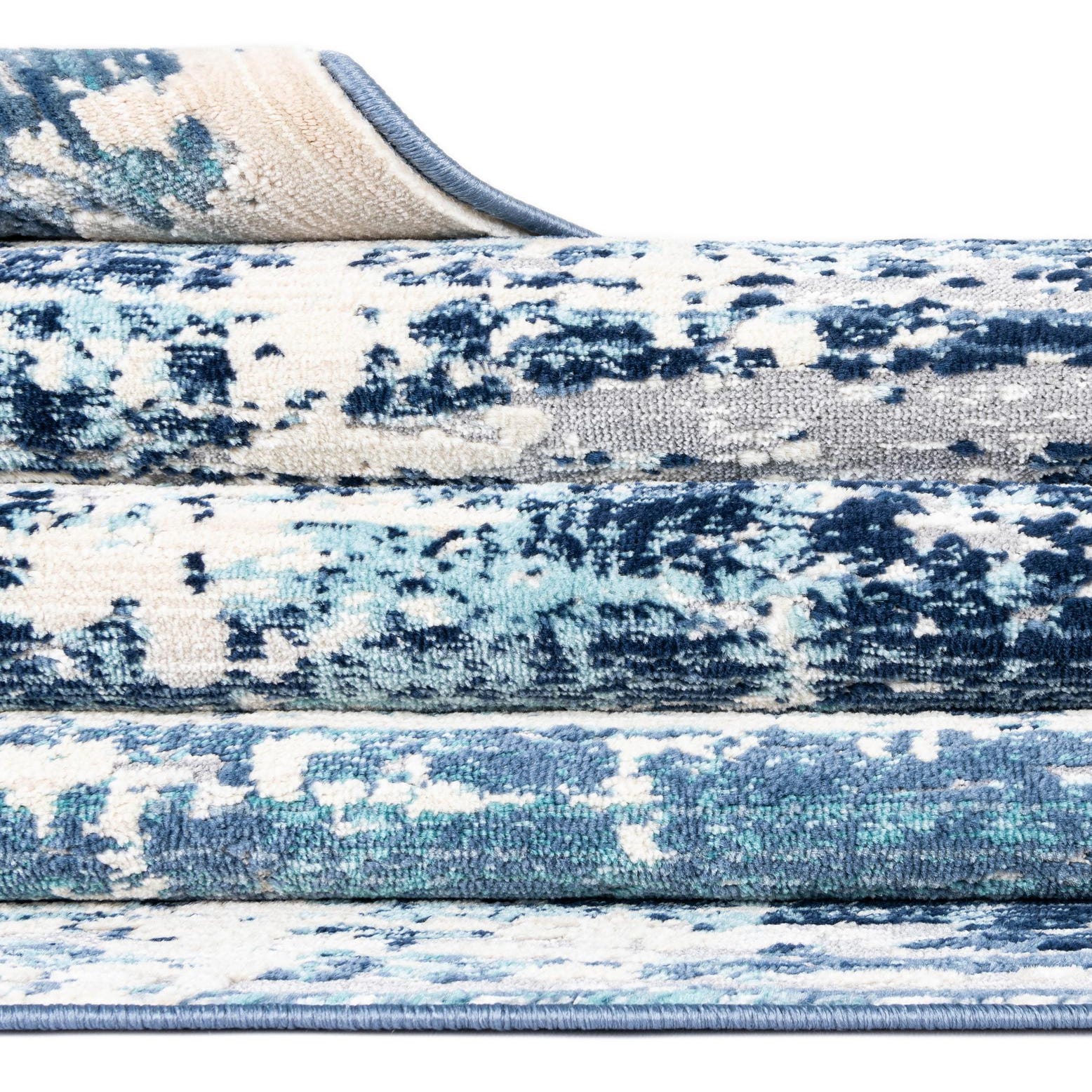 The variety of blue hues intertwined with gray and ivory creates a serene visual appeal that emulates the tranquility of oceanic landscapes, lending itself to contemporary design settings. The shed-free nature of the rug coupled with its stain-resistant properties makes it an ideal choice for high-traffic areas, living rooms, dining spaces, or coastal-themed interiors. With its blend of colors and textures, this rug would seamlessly complement interiors with cool color palettes, modern furniture, and minimalist decor.