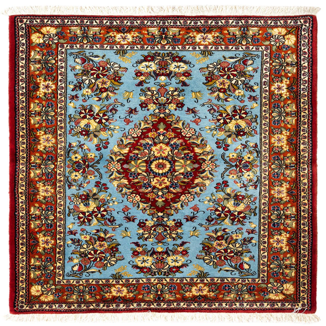 A traditional Persian medallion design set against a clear blue field gives this hand-knotted wool rug a classic, balanced look. A deep red central medallion anchors layered floral motifs in gold, cream, navy and olive, while matching floral sprays and fine arabesques fill the field with symmetrical detail. A rust-red outer border with repeating blossom motifs and narrow guard borders frames the composition, creating a measured contrast between the cool blue center and the warmer reds and gold tones.