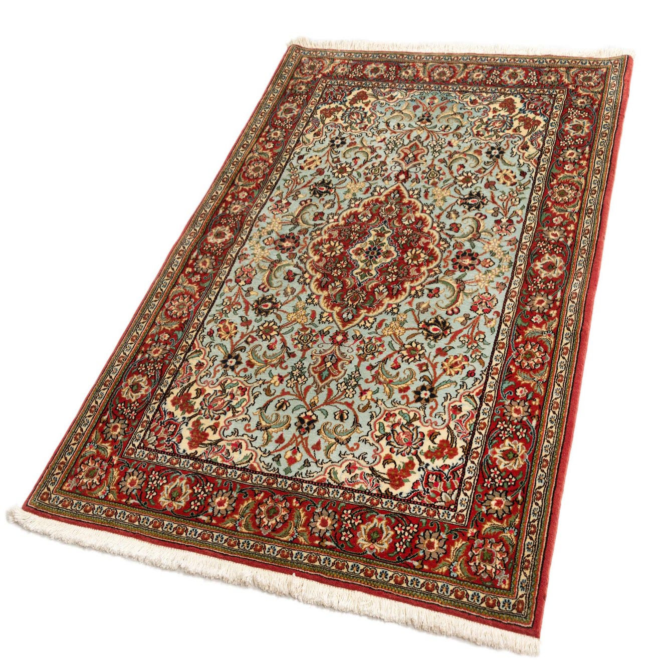 A 3x5 rectangular Persian wool rug with a light blue field and intricate floral patterns in red, gold, and green, framed by a detailed red border.