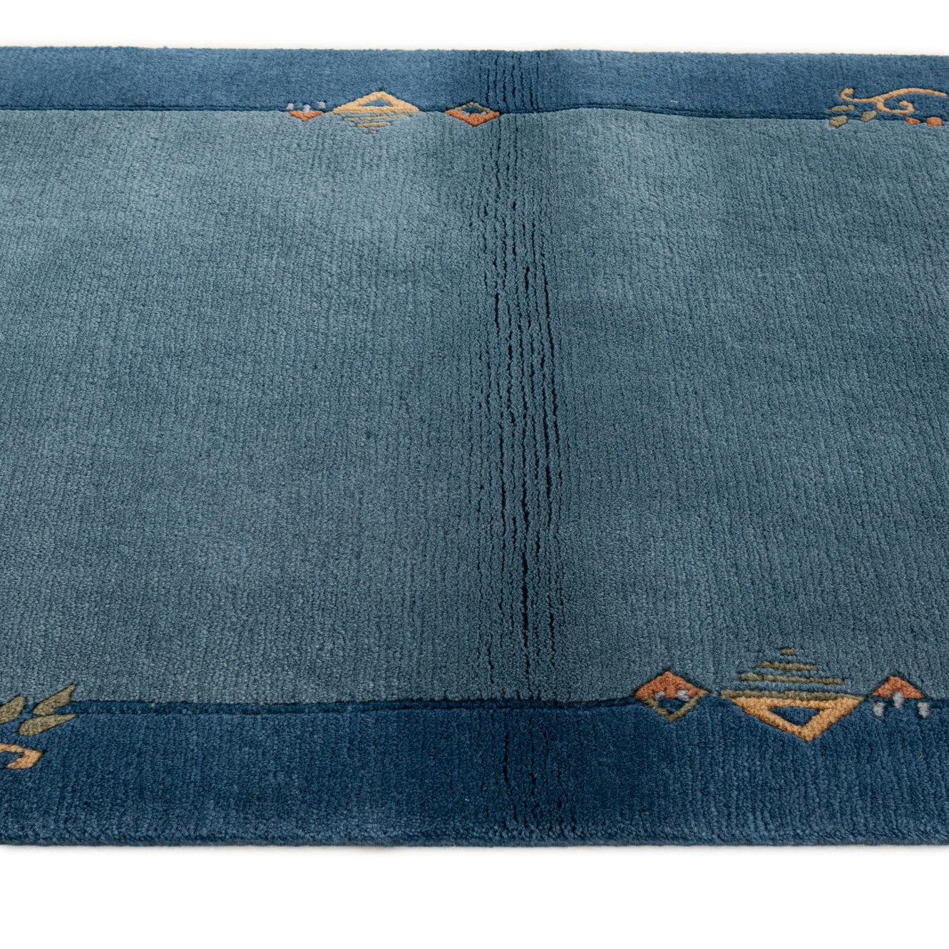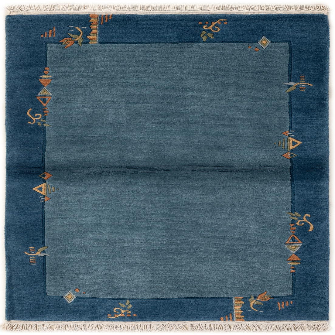 A 3x5 rectangular blue wool rug with a darker blue border featuring abstract oriental motifs in orange, green, and yellow.