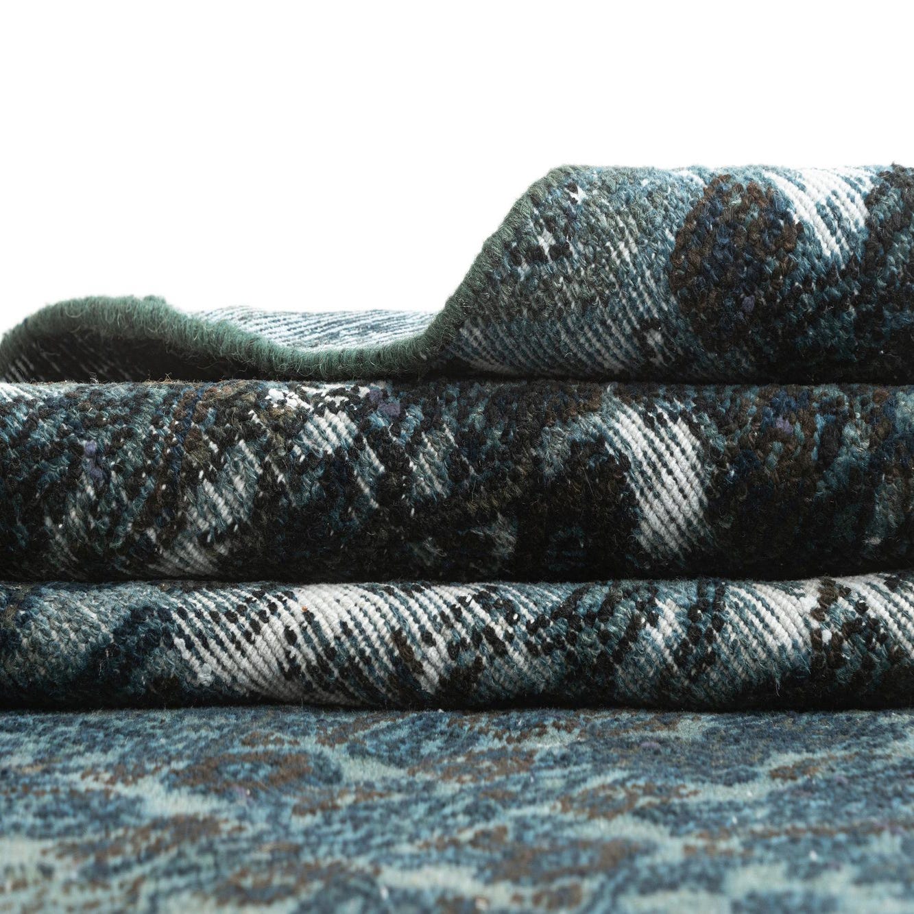 A 3x5 rectangular blue wool vintage rug with an ornate, distressed pattern, ideal for an entryway.
