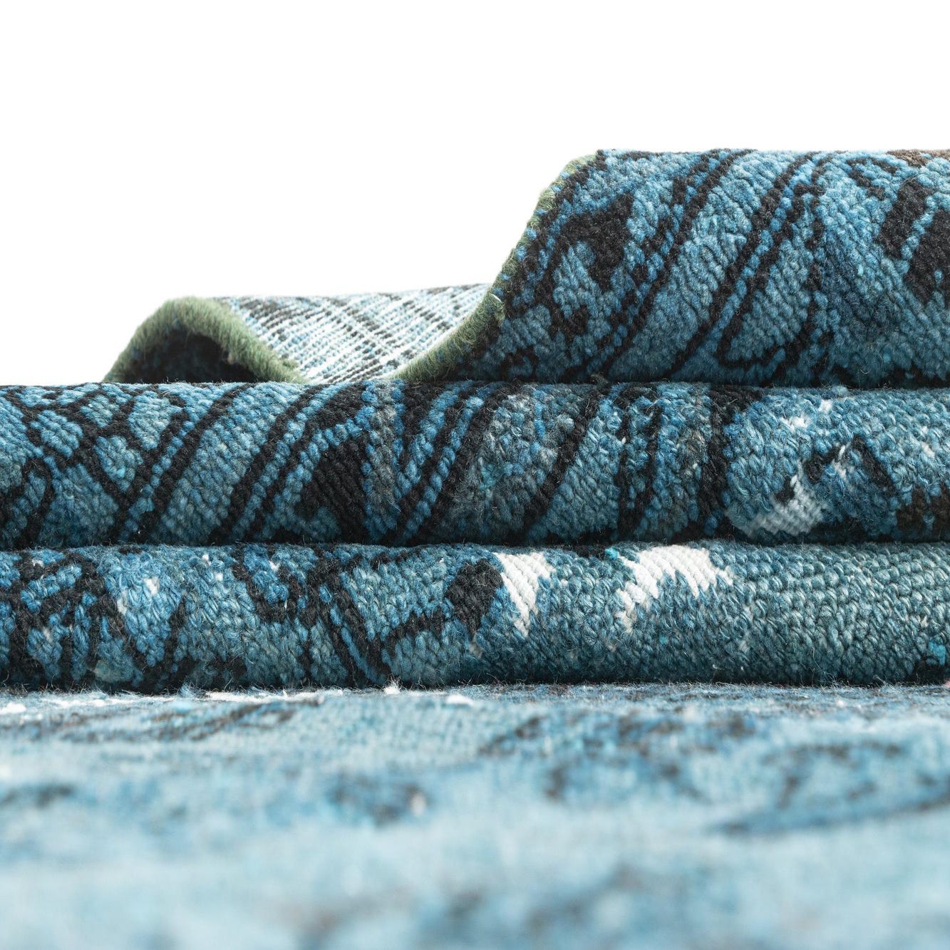 A 3x5 rectangular blue vintage wool rug with a distressed traditional pattern, ideal for a kitchen or entryway.
