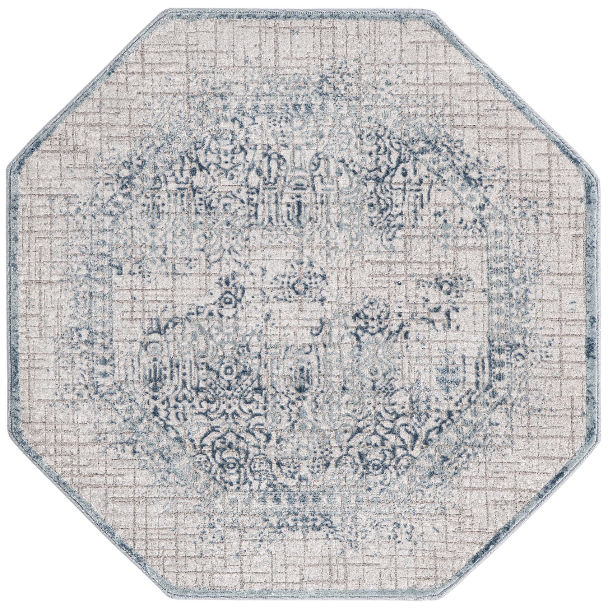 A machine-made octagonal rug woven from 60% polypropylene and 40% polyester, this piece features a blue background that anchors a softly aged medallion in beige and ivory. The design pairs classic floral motifs with a layered, crosshatch grid that gives the pattern depth and a gently distressed feel. Run your hand across the low pile and you’ll notice a smooth, slightly plush surface with a subtle sheen from the polyester fibers and the forgiving texture of polypropylene underfoot.